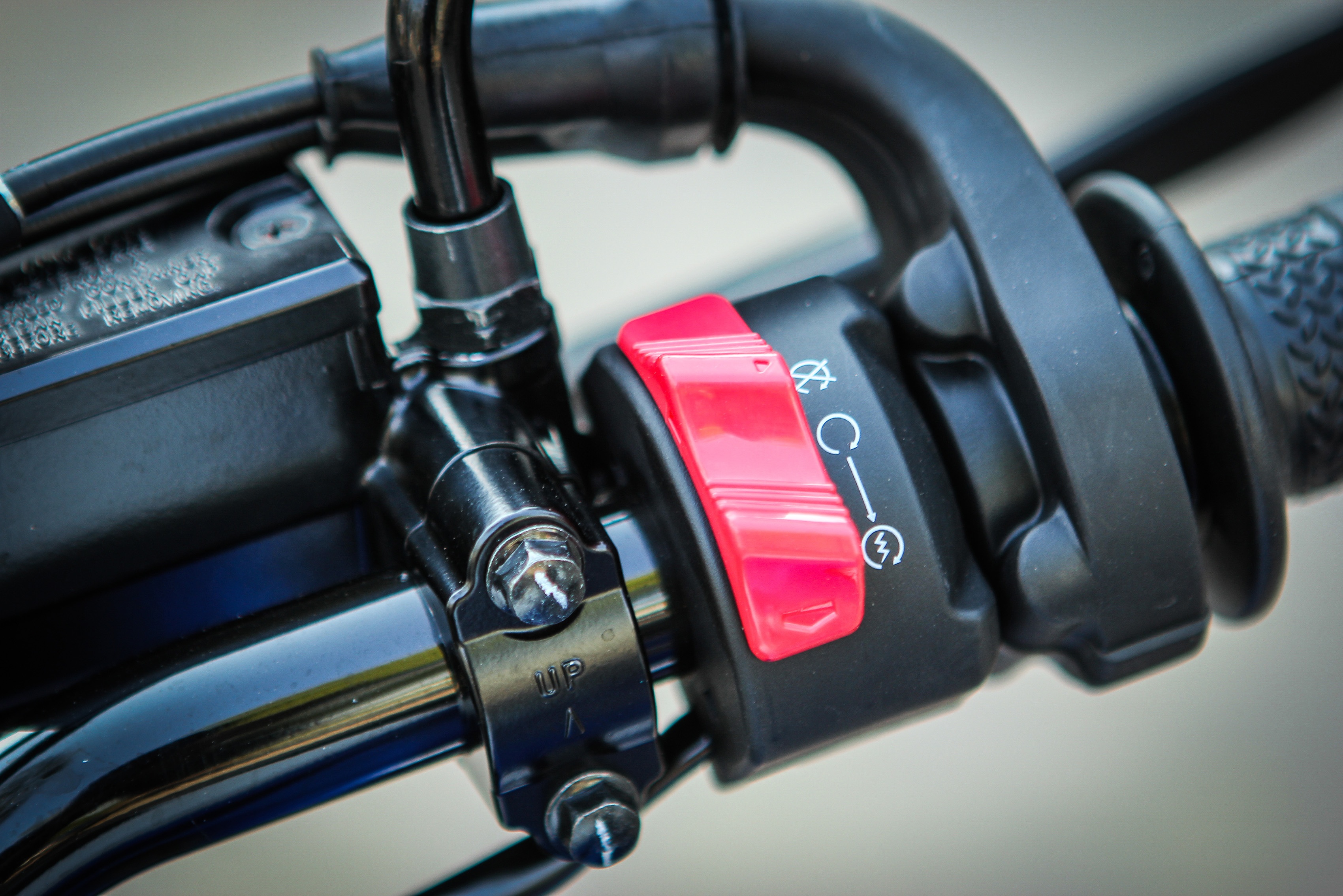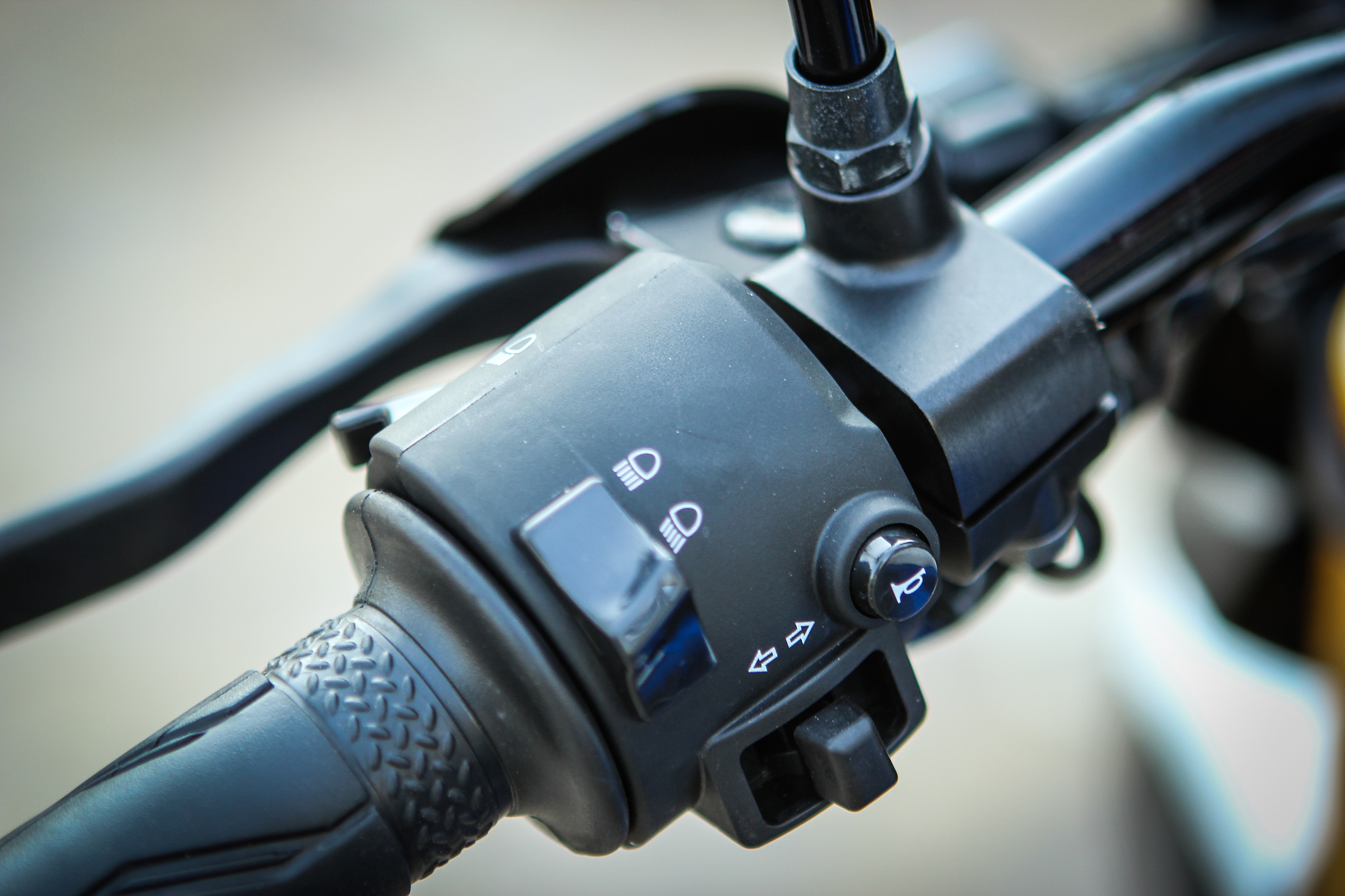 | Cụm điều khiển bên trái của M-Slaz khá lạ khi nút bấm còi được đặt xa và ở phía trên công tắc đèn xi-nhan. Công tắc đèn passing được bố trí phía trước. |