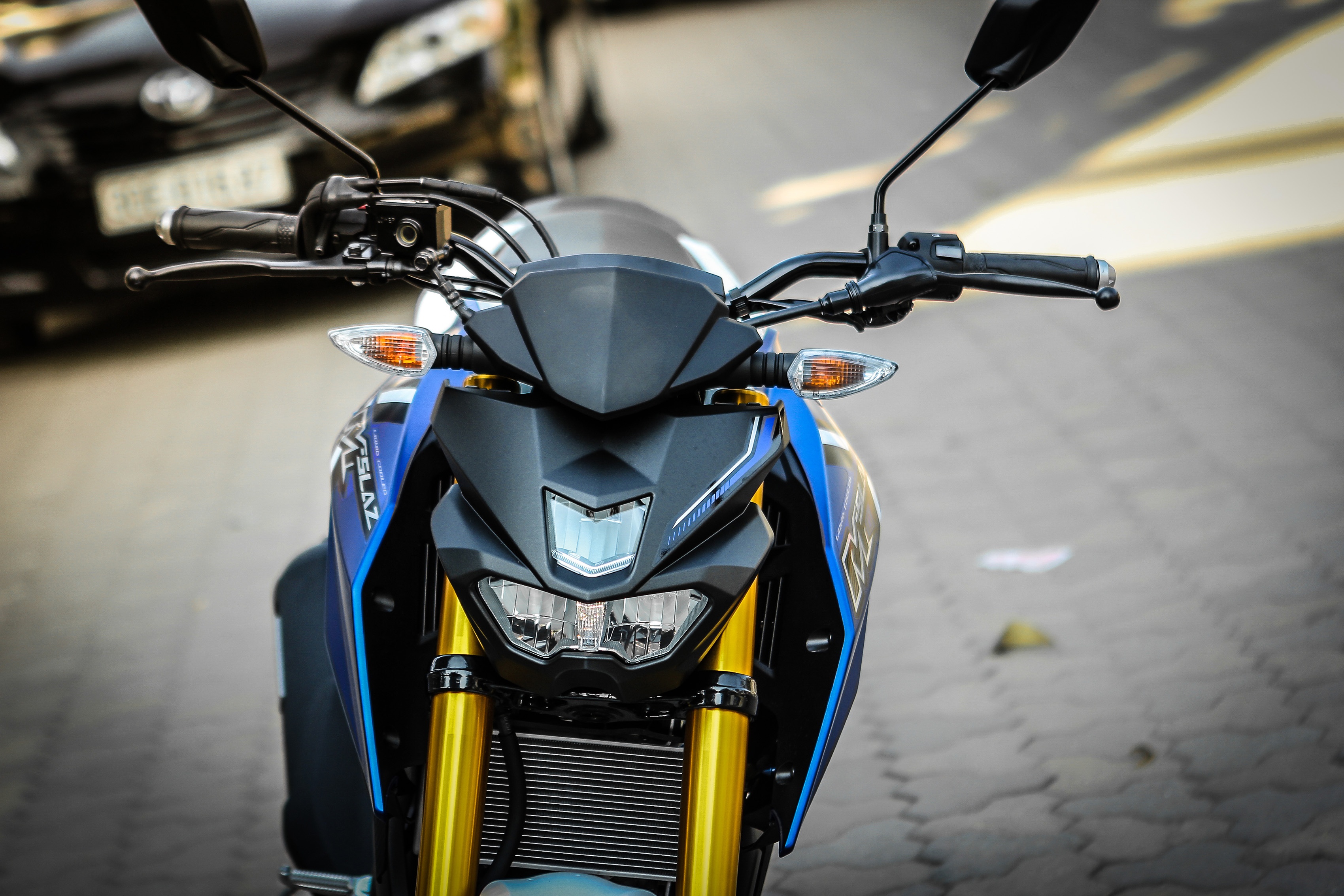 | Thiết kế đầu xe khá dữ tợn, với nhiều đường nét cắt xẻ, góc cạnh ở thiết kế cụm đèn. M-Slaz sở hữu bộ đèn pha và đèn định vị dạng LED. Đèn xi-nhan thiết kế khá giống với xi-nhan của FZ150i và được đặt cao hơn cụm đèn pha. |