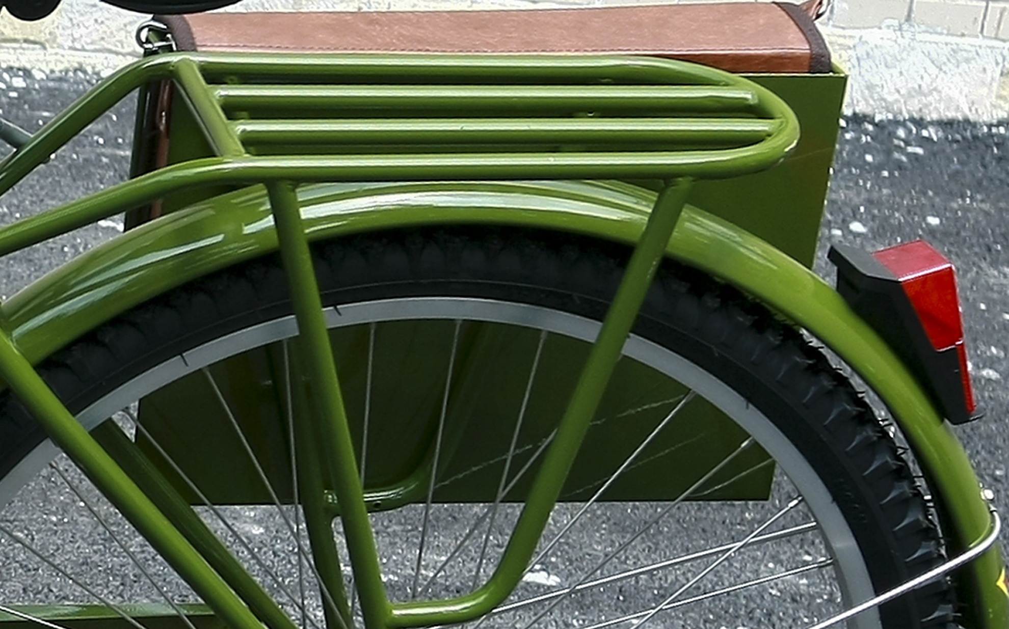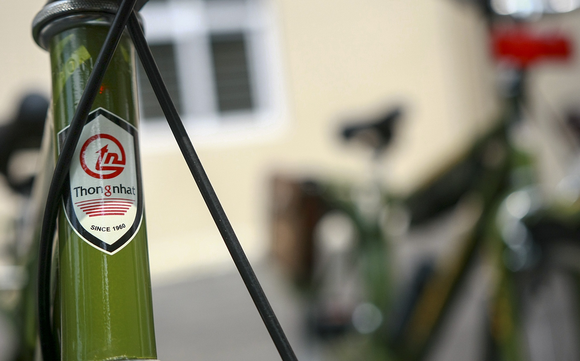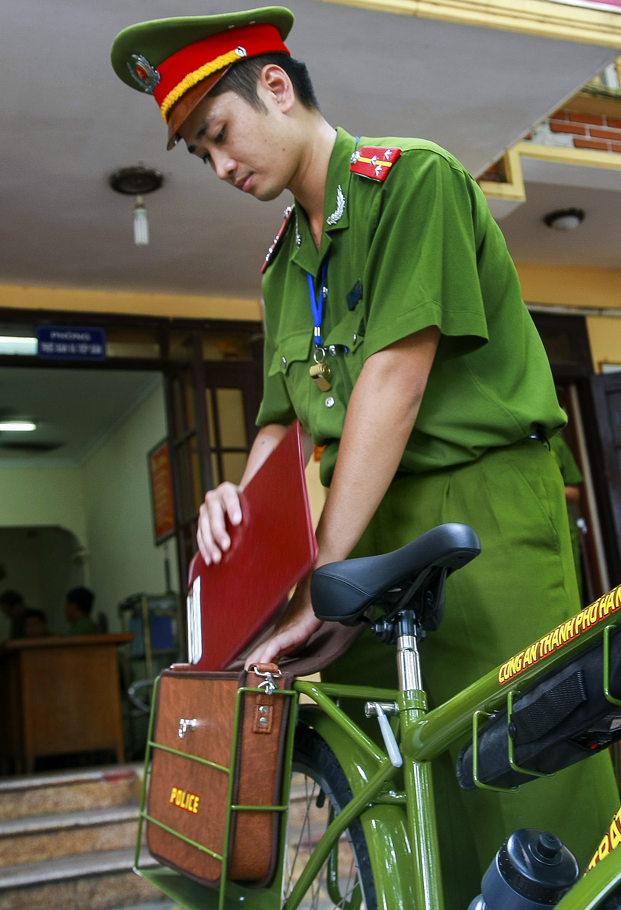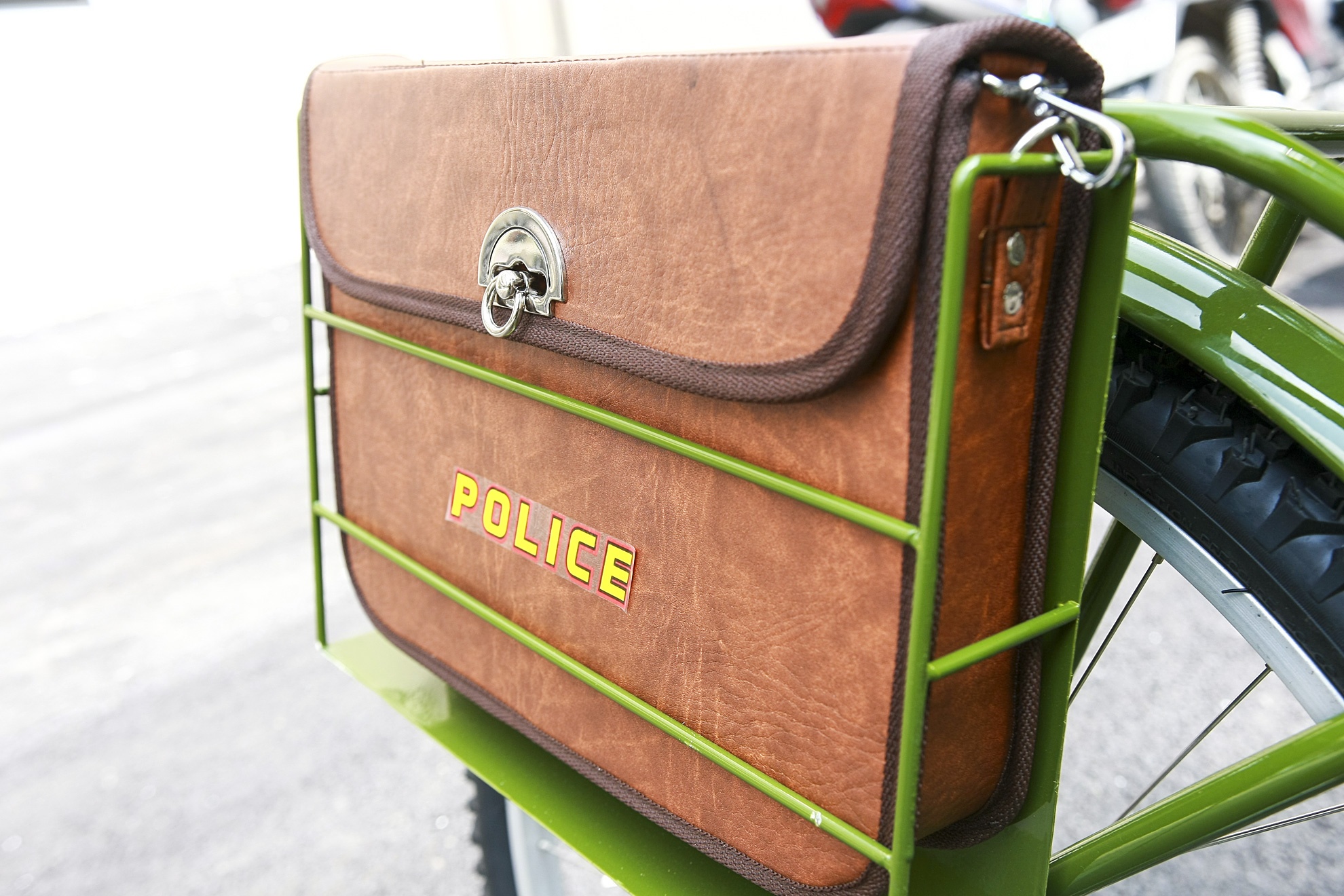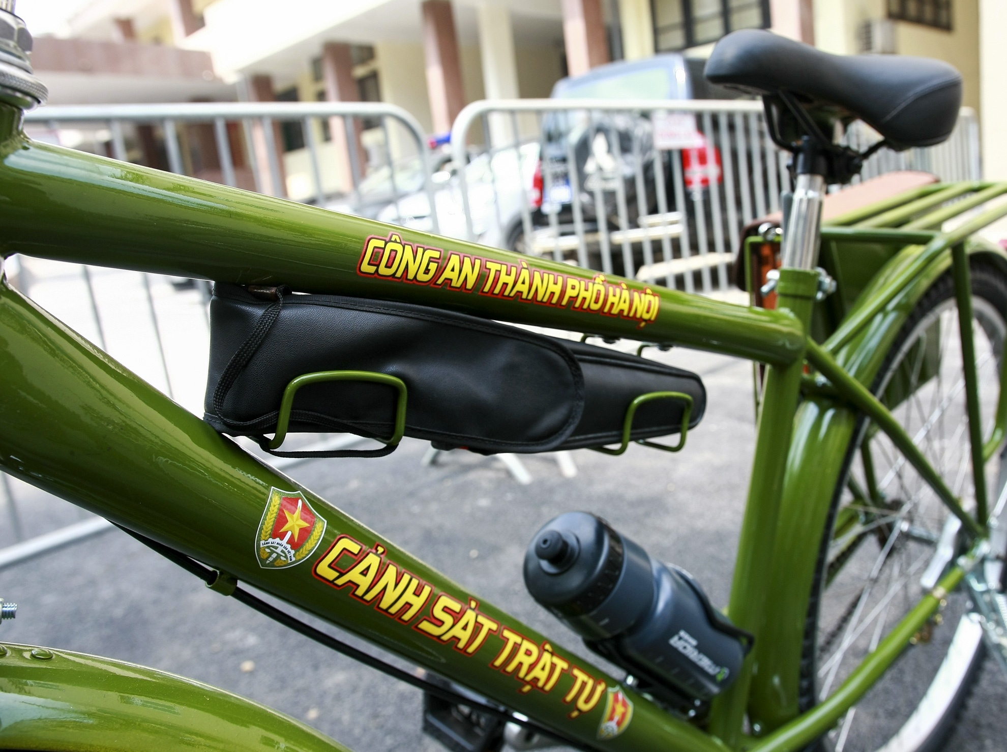 Xe đạp dành cho cảnh sát trật tự đi tuần được trang bị giỏ đựng túi da, đèn pin, bình nước, do một công ty của Việt Nam sản xuất.