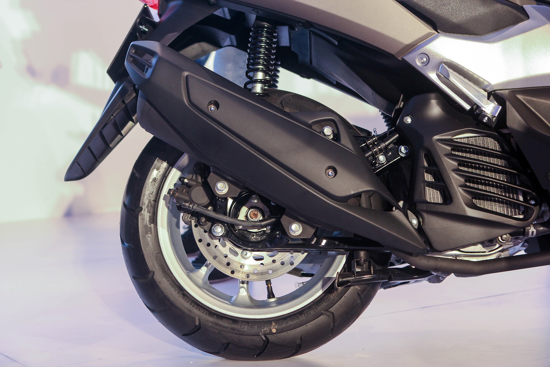 | Phía sau, xe được trang bị giảm xóc đôi, phanh đĩa hỗ trợ ABS, lốp không săm kích thước 110/70-13. |