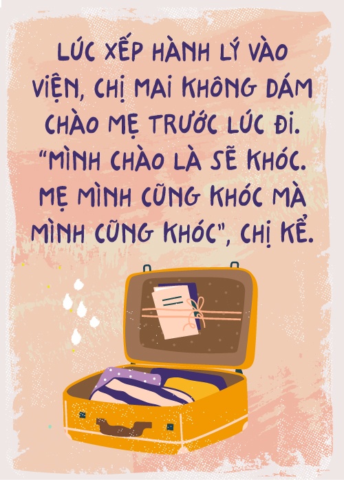 Ngày 30/7, lúc xếp hành lý vào viện, chị Mai không dám chào mẹ trước lúc đi. “Mình chào là sẽ khóc. Mẹ mình cũng khóc mà mình cũng khóc”, chị kể, mắt ngấn lệ. Dù đã 53 tuổi, trong mắt mẹ, chị vẫn chỉ là đứa con gái phải ra tiền tuyến trong một trận chiến chưa biết ngày về.