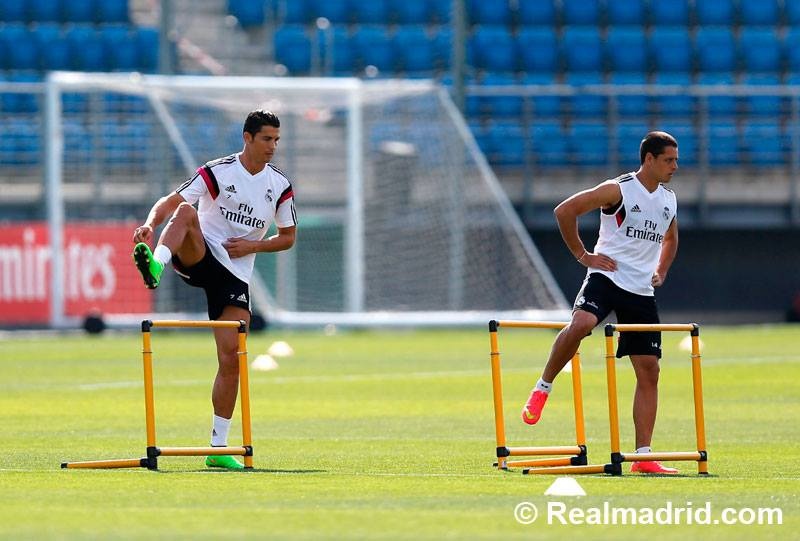 | Chicharito và Ronaldo trong buổi tập hôm qua của Real. Ảnh: Realmadrid. |