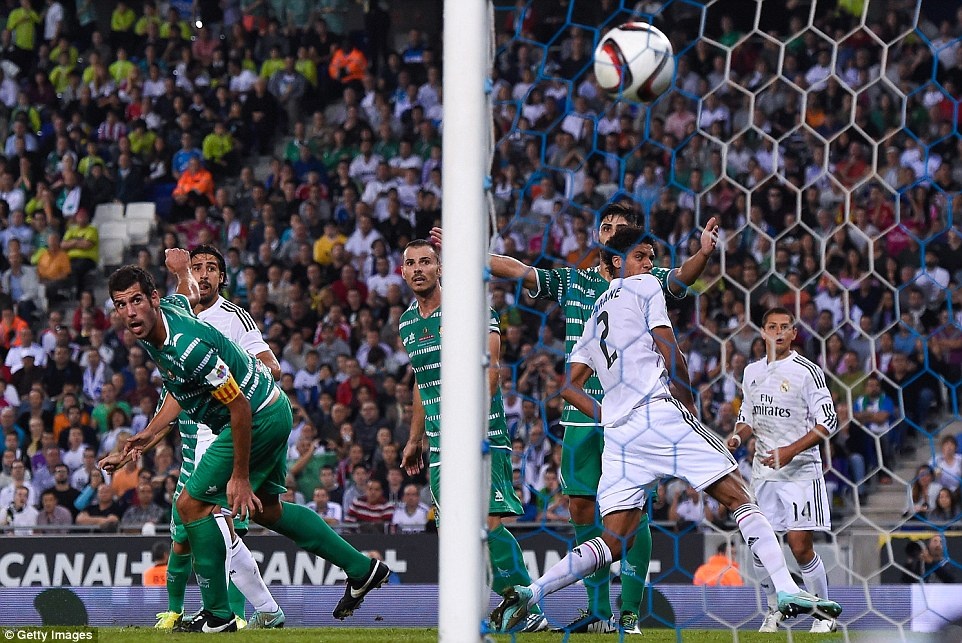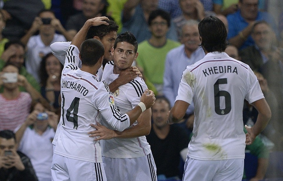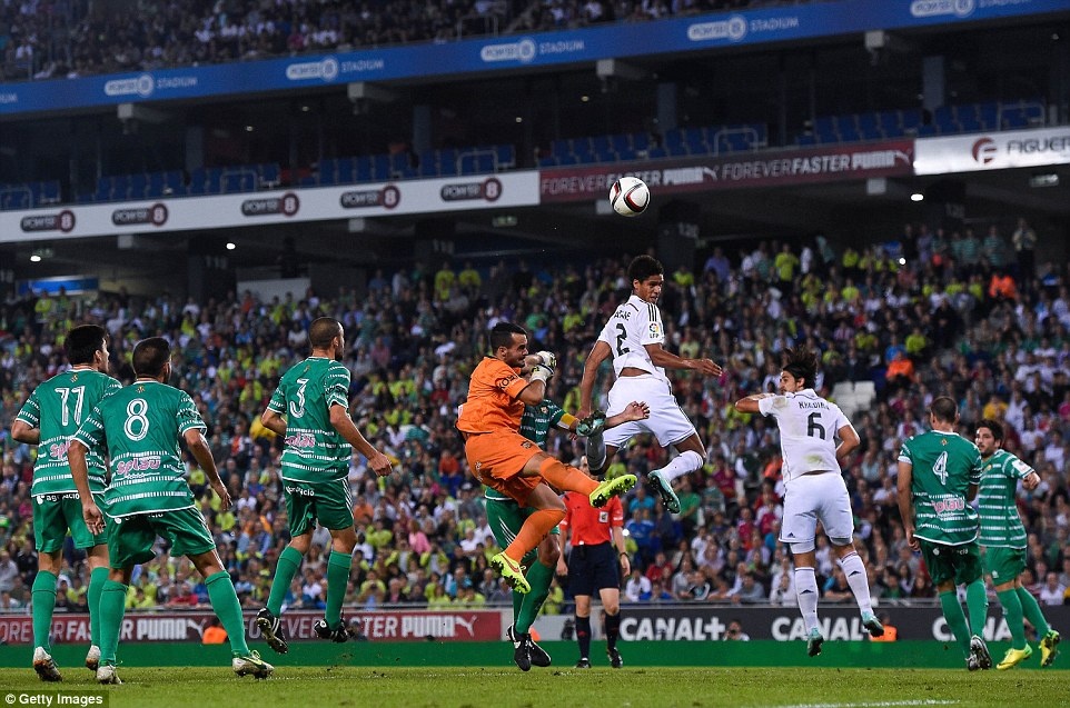 | Ngay ở phút thứ 9, trung vệ lên tham gia tấn công Varane đã mở tỷ số cho đội khách bằng pha đánh đầu dũng mãnh. James Rodriguez là người kiến tạo với cú đá phạt góc chuẩn xác bên cánh phải. |