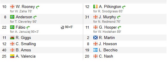 Dù đưa ra sân không phải đội hình mạnh nhất, nhưng MU vẫn chiếm thế chủ động trên sân ngay sau tiếng còi khai cuộc. Cầu thủ nhận được sự quan tâm nhiều nhất bên phía đội chủ sân Old Trafford là Chicharito, tiền đạo thay thế Van Persie và Rooney dẫn dắt hàng công của Quỷ đỏ.