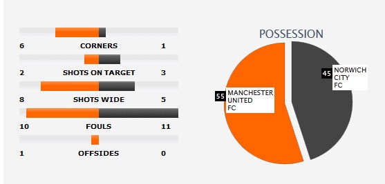 Khi hiệp 1 của trận đấu diễn ra được khoảng một nửa thời gian, MU đã có bàn mở tỷ số ở phút 20. Sau tình huống Januzaj bị phạm lỗi trong vòng 16m50, Quỷ đỏ được hưởng quả phạt 11m, và Chicharito không mắc bất cứ sai lầm nào trong tình huống đối mặt với thủ môn Bunn bên phía Norwich.