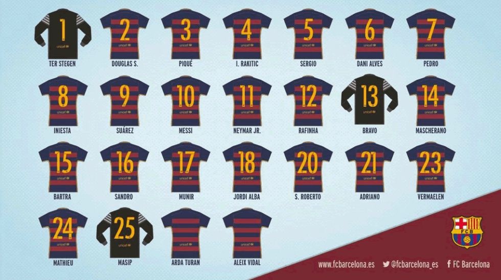 Trong 25 cầu thủ có tên trong danh sách chinh phục mùa tới, tân binh Arda Turan và Aleix Vidal đều chưa có số áo. Cựu cầu thủ của Atletico và Sevilla sẽ nhận được số áo sau khi nhà đương kim vô địch châu Âu hoàn thành án cấm chuyển nhượng từ FIFA tới hết năm 2015.