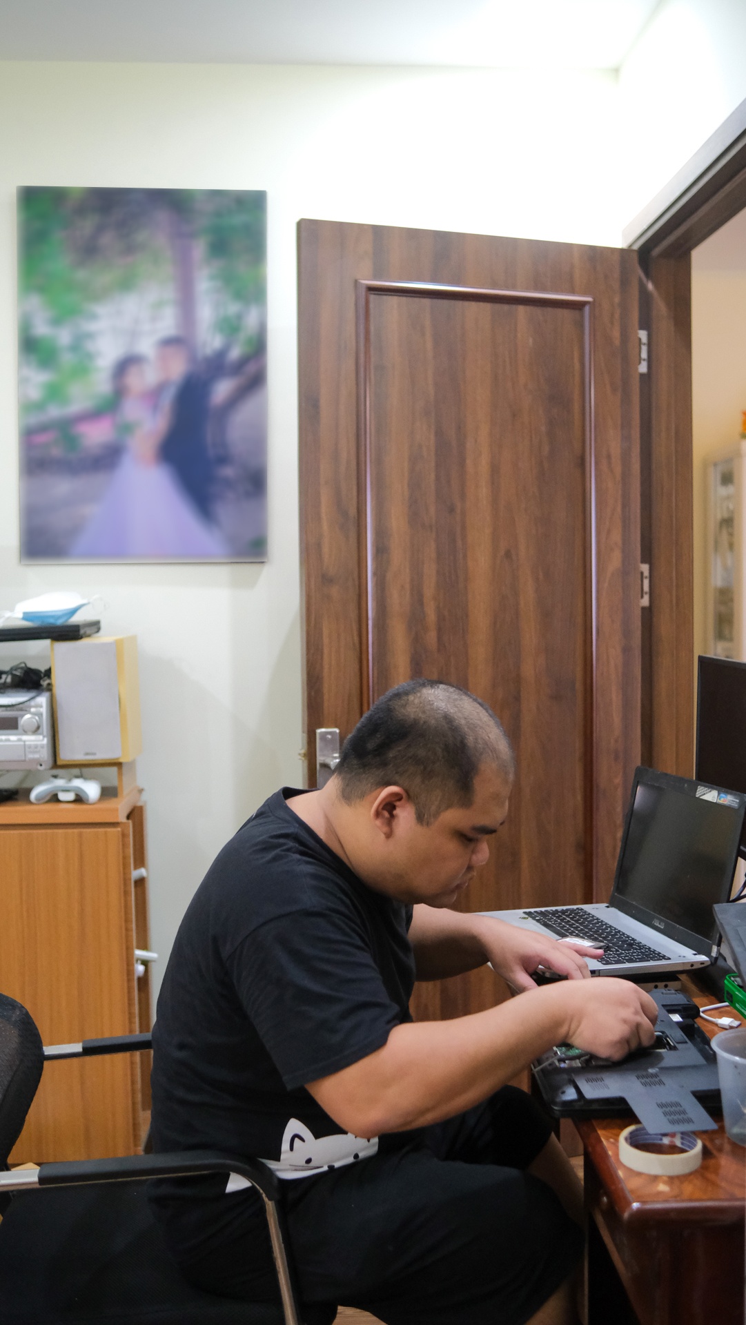 | Anh Thuận là một trong 3 kỹ thuật viên của nhóm. Hà Nội vẫn đang hạn chế đi lại do dịch bệnh, chúng tôi chủ yếu sử dụng dịch vụ giao hàng để giao, nhận máy. |