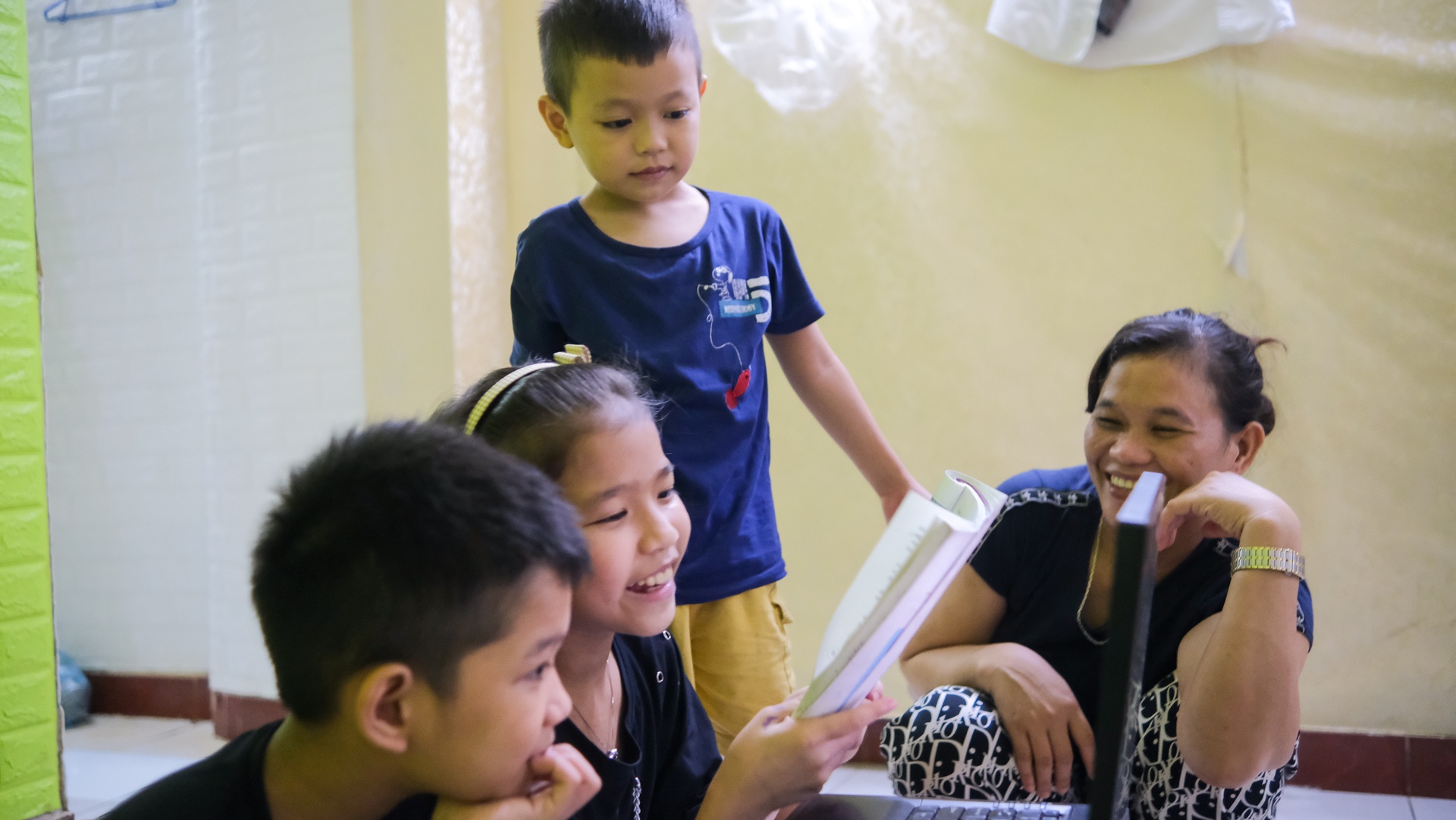 | Vũ Phong (lớp 5) cẩn thận đọc ghi chú sử dụng máy được đính kèm. Từ khi vào năm học mới, Phong và em gái sinh đôi Mỹ Duyên được nhà hàng xóm cho mượn chiếc laptop cũ để nghe giảng song âm thanh không rõ, thường phải nhờ cô giảng lại kiến thức vào buổi tối sau giờ học. Cậu em Đức Giang, lớp 3, dùng điện thoại cũ của mẹ. |