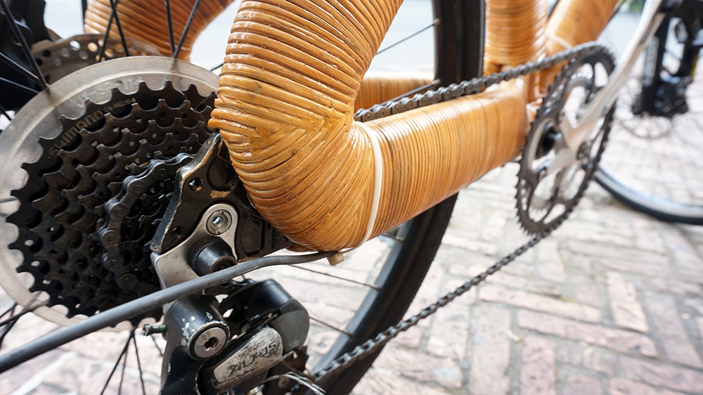 | Toàn bộ phần khung đều làm từ sợi mây. Những chi tiết như bánh răng, xích, lốp, mâm xe là không thể thay thế. |