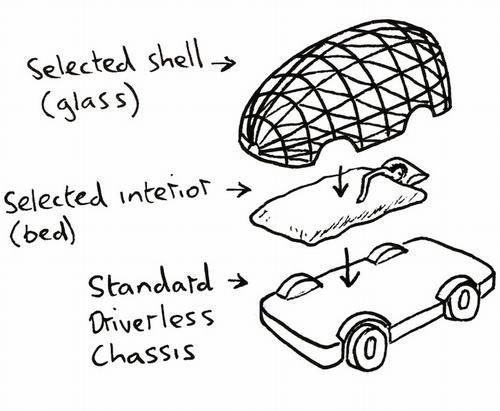 Chiếc xe hơi siêu “độc” này được tạo ra bởi nghệ sĩ Dominic Wilcox, là sự kết hợp giữa tính năng và thiết kế thành một chiếc ô tô đẹp. Đây có thể là một loại xe của tương lai, chiếc xe không người lái với chỉ một chiếc giường bên trong, một hành khách duy nhất sẽ có thể nằm xuống ngủ một giấc trong khi xe vẫn tự đi đến đích mà người chủ muốn.