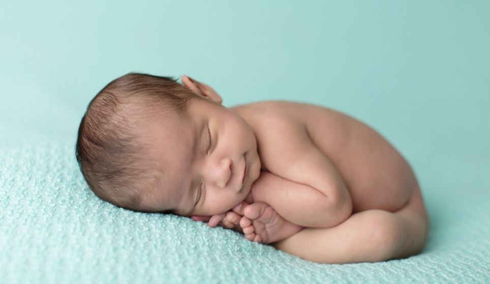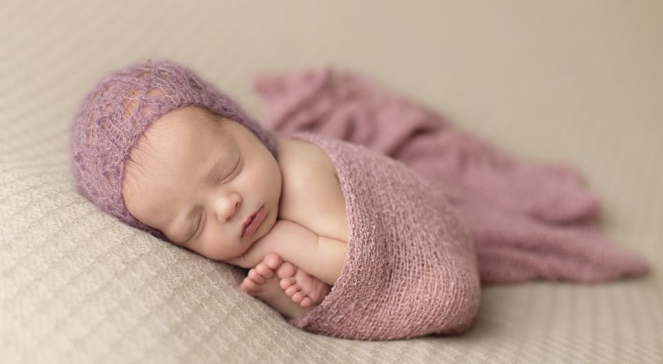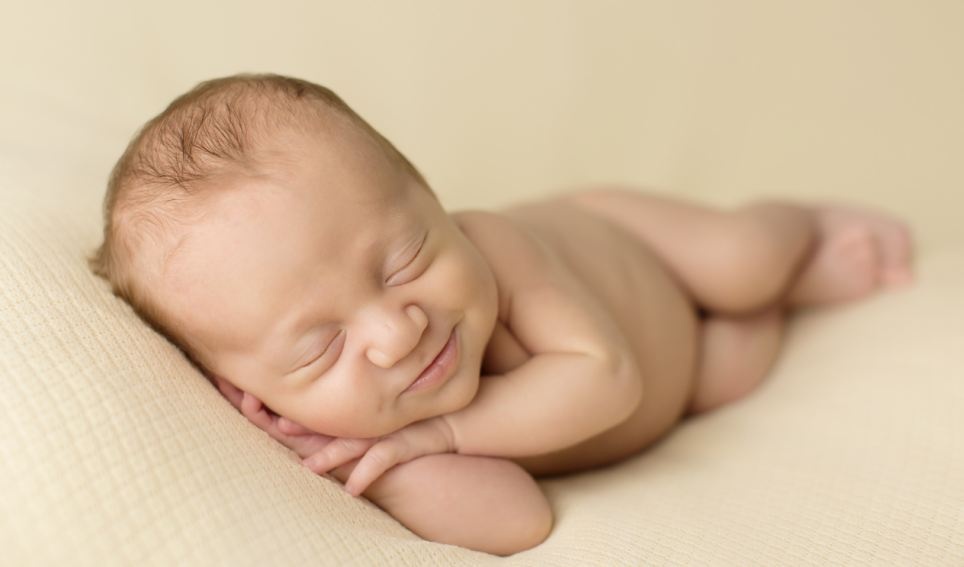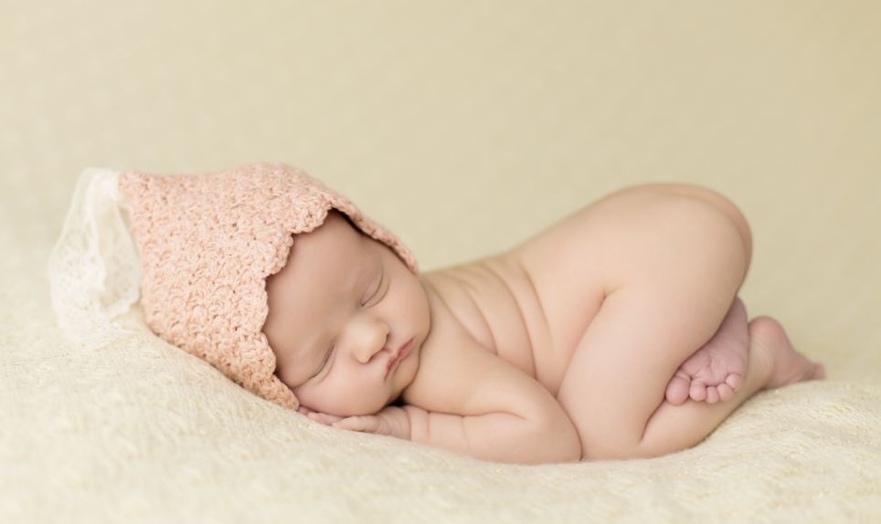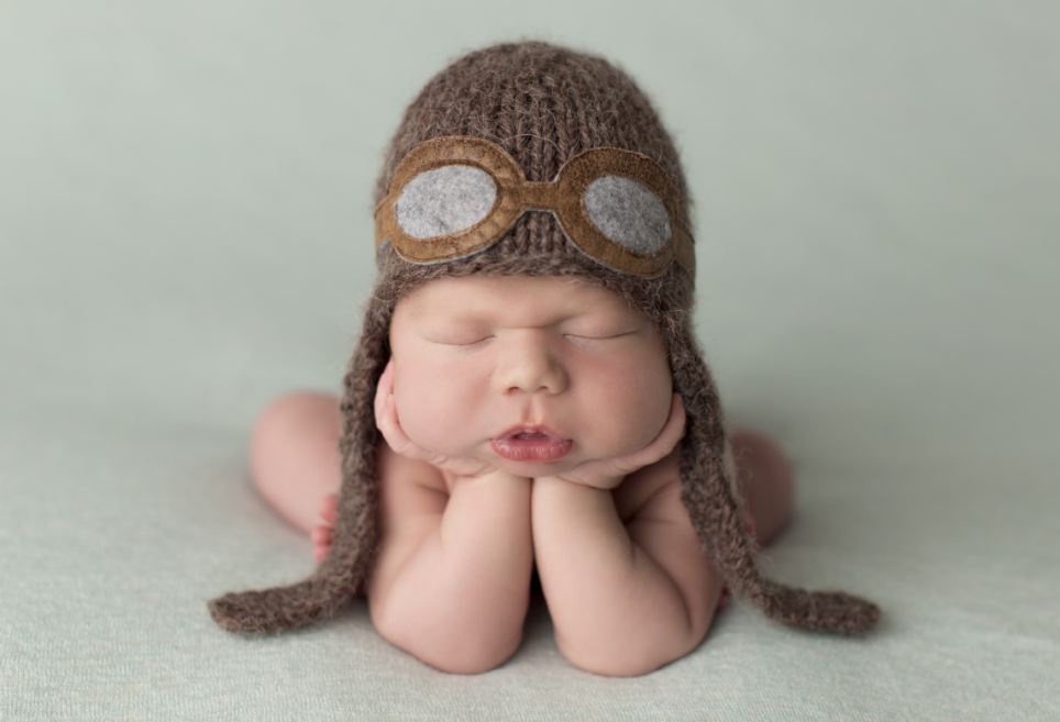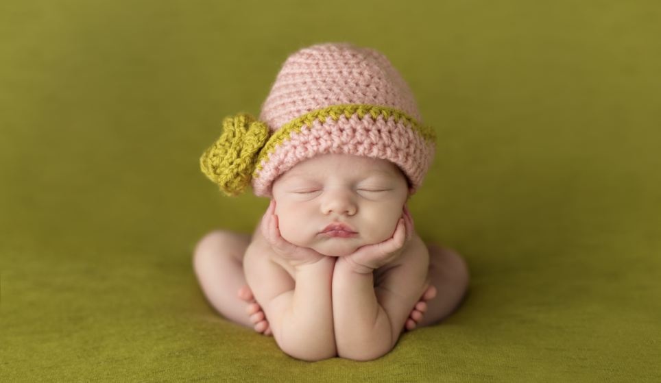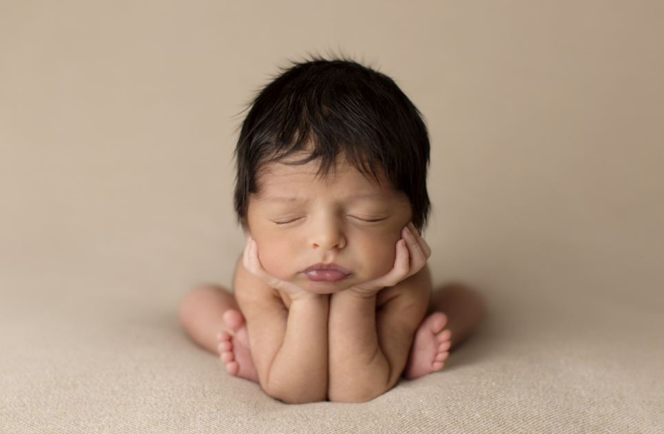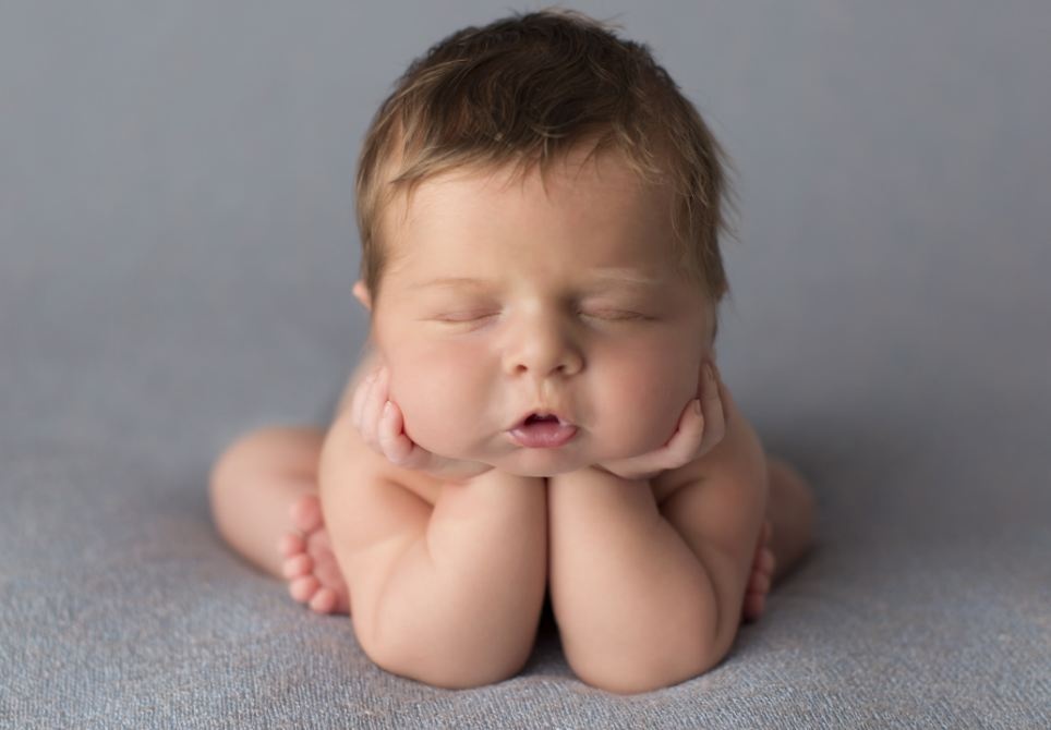 Nhiếp ảnh gia nhẹ nhàng đặt em bé trong tư thế ngồi thoải mái với tay chống cằm. |