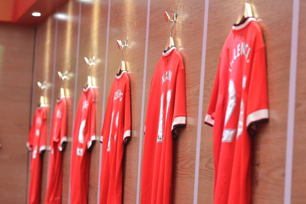 | Cùng sang Việt Nam với Pallister đợt này là nhiều kỷ vật đáng giá của M.U. Trên hình là những chiếc áo đấu của đội bóng được dàn dựng giống như trong phòng thay đồ tại sân Old Trafford. |