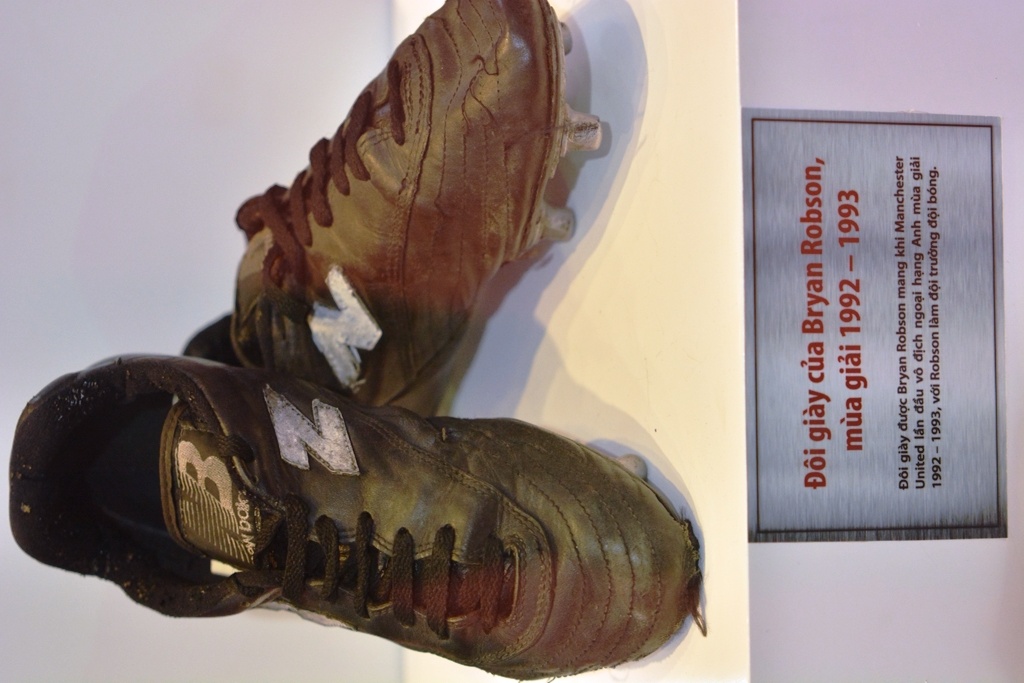 | Đôi giày của cựu đội trưởng Bryan Robson ở mùa bóng M.U lần đầu VĐQG dưới thời Alex Ferguson. |