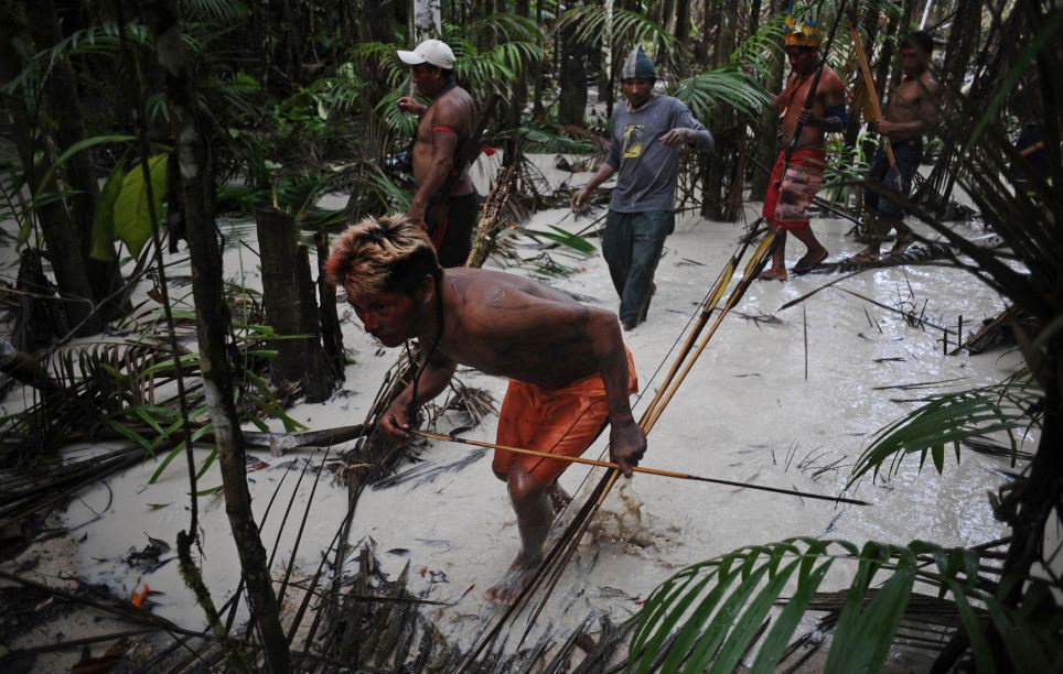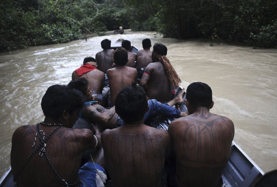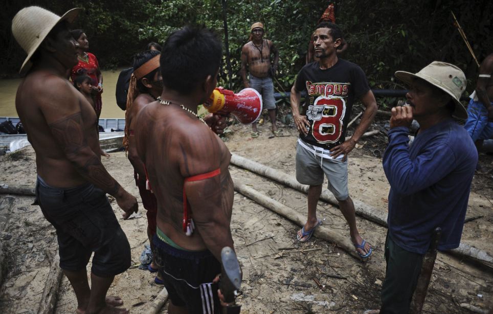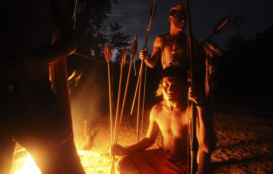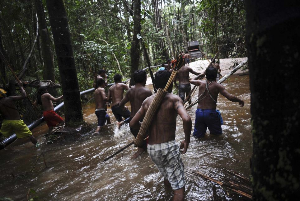 Các chiến binh của bộ tộc ở Brazil mang giáo và dao để đuổi những kẻ đào vàng tại rừng Amazon nhằm bảo vệ lãnh địa của họ.