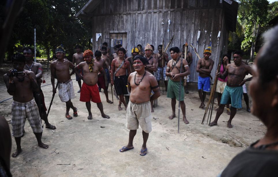 | Các chiến binh họp tại làng Retiro das Cobras, nơi bộ tộc Munduruku sinh sống, để bàn chiến lược đuổi những kẻ đào vàng. |