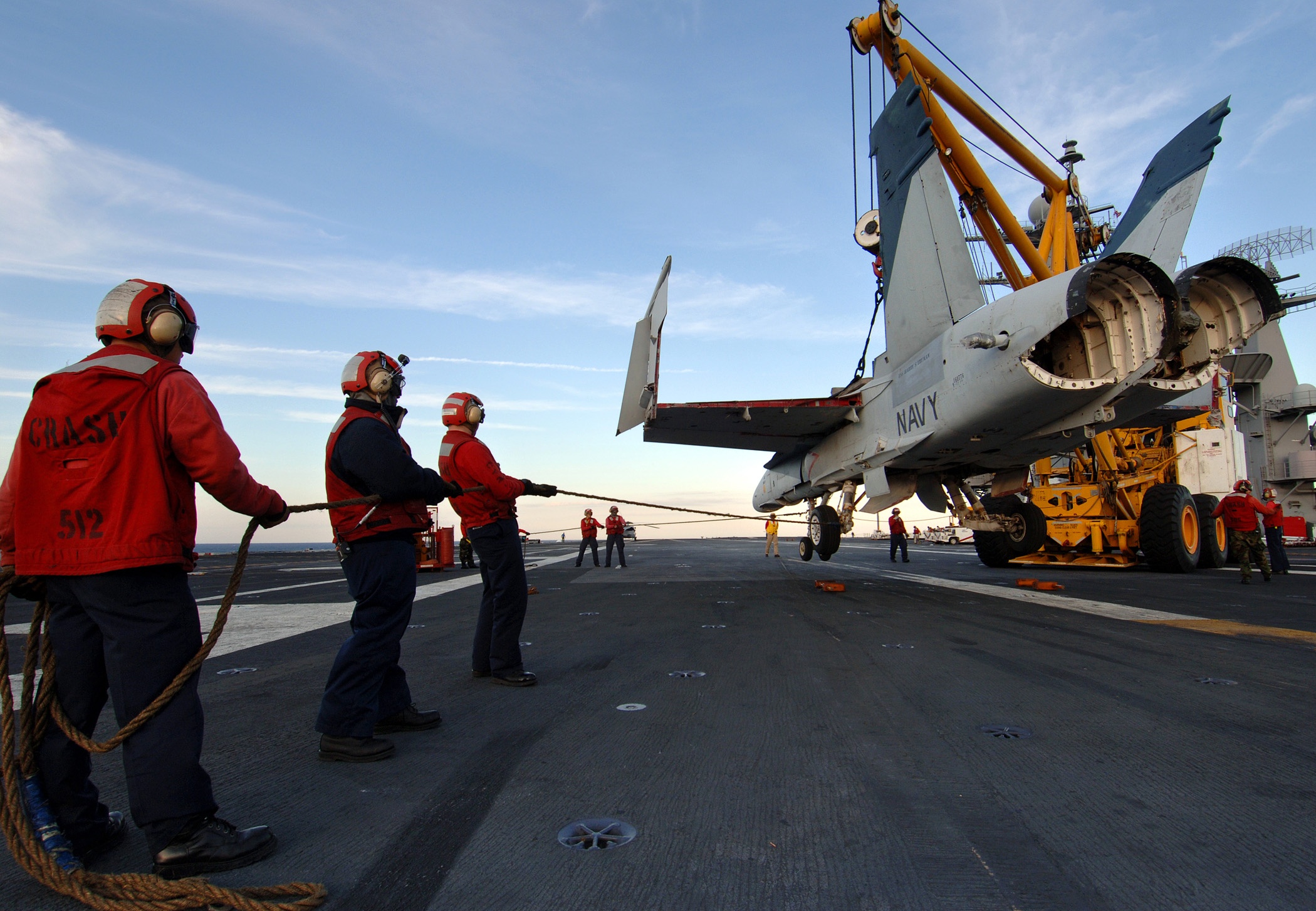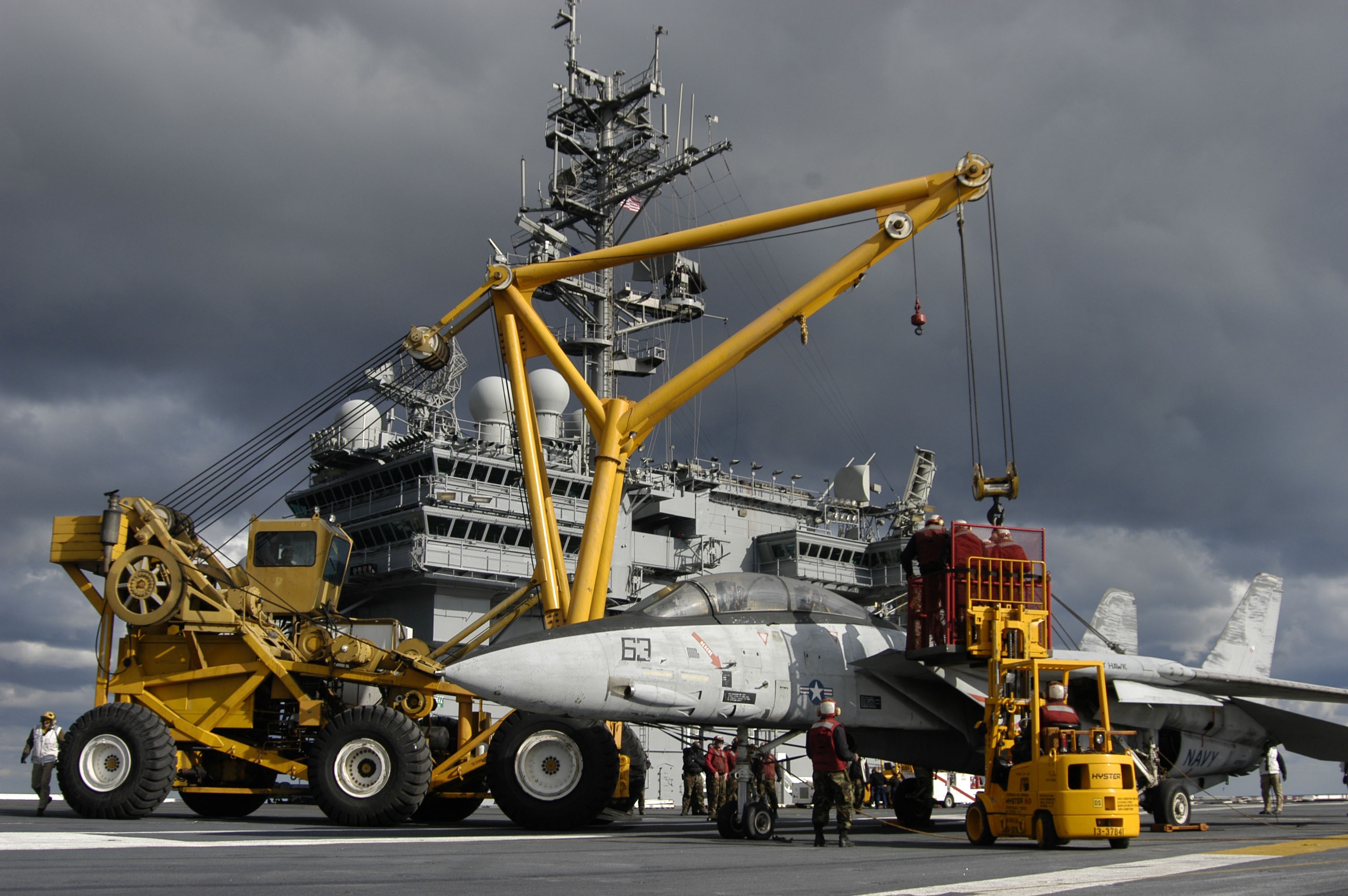 Các chuyên viên trên hàng không mẫu hạm USS Kitty Hawk (CV 63) dùng cần cẩu để di chuyển một máy bay phản lực chiến đấu F-14 Tomcat bị hỏng. Phi cơ gặp sự cố khi hoạt động trên tàu. |