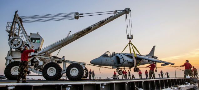 Xe cẩu chuyên dụng nhấc chiếc AV-8B Harrier bị hỏng từ tàu đổ bộ tấn công USS Kearsarge của Hải quân Mỹ. Do diện tích mặt sàn lớn nên các loại trực thăng và máy bay phản lực hạ cánh thẳng đứng như Harrier dễ dàng hoạt động trên USS Kearsarge. |