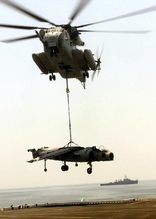 Bên cạnh việc đưa máy bay từ tàu vào đất liền, người Mỹ cũng thực hiện những việc ngược lại. Trực thăng vận tải hạng nặng CH-53 Sea Stallion đưa một chiếc máy bay AV-8B Harrier bị loại khỏi biên chế lên tàu đổ bộ tấn công USS Saipan (LHA 2) của Hải quân Mỹ. Chiếc máy bay sẽ nằm trên boong tàu khi nó trở lại cảng Norfolk, Virginia. |