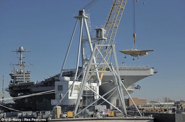 Cần cẩu cũng giúp đưa các máy bay mới lên tàu sân bay. Hải quân Mỹ đưa X-47B, máy bay tàng hình không người lái chuyên hoạt động trên tàu sân bay, lên hàng không mẫu hạm USS Harry S. Truman để thử nghiệm trên biển. Một cần cẩu lớn đưa máy bay không người lái lên boong tàu. |