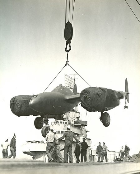 Cách thức đưa máy bay lên tàu sân bay của người Mỹ không thay đổi nhiều so với những năm thế chiến thứ hai. Cần cẩu đưa máy bay chiến đấu P-38 lên boong tàu sân bay USS Ranger (CV-4) của Hải quân Mỹ ngày 21/4/1944. |
