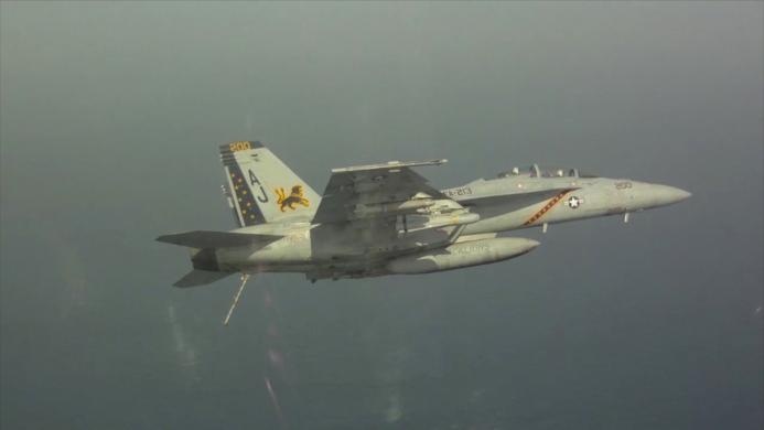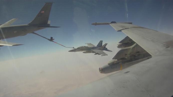 Máy bay tiếp nhiên liệu trên không bơm xăng cho một chiếc F/A-18F Super Hornet. Do khoảng cách từ tàu sân bay tới khu vực không kích quá lớn nên việc tiếp nhiên liệu cho các máy bay là vô cùng cần thiết. |