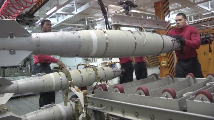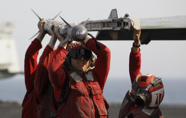 Thủy thủ đoàn lắp đặt tên lửa lên cánh một chiếc F/A-18F Super Hornet trước khi nó cất cánh từ mặt sàn tàu sân bay. |