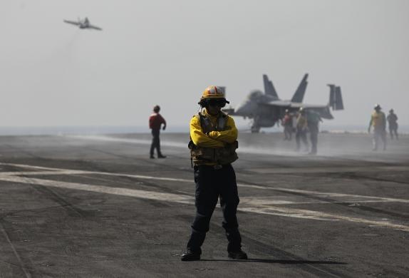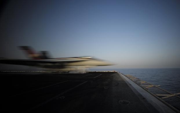 Các hoạt động trên hàng không mẫu hạm diễn ra liên tục trong mỗi đợt không kích. Chuyên viên chuẩn bị đưa máy bay khác vào vị trí phóng sau khi một chiếc F/A-18C Hornet rời tàu. |