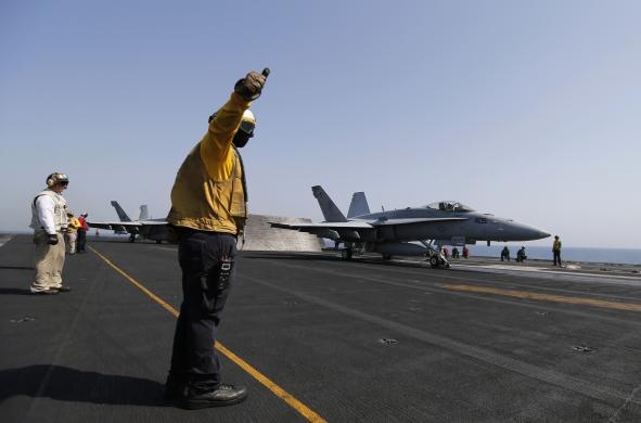 Các chuyên viên trên tàu sân bay USS George H.W. Bush chuẩn bị cho một chiếc F/A-18C Hornet xuất kích tấn công căn cứ của tổ chức Nhà nước Hồi giáo Iraq và Syria (ISIS) đang làm mưa làm gió trên lãnh thổ Iraq. |
