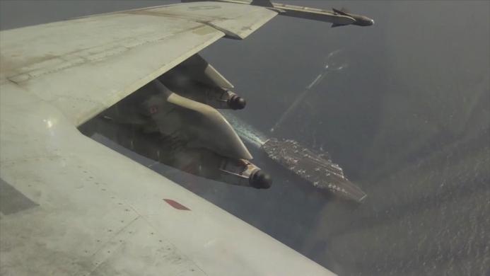 Máy bay thả móc để chuẩn bị đáp xuống hàng không mẫu hạm sau khi hoàn thành nhiệm vụ. |