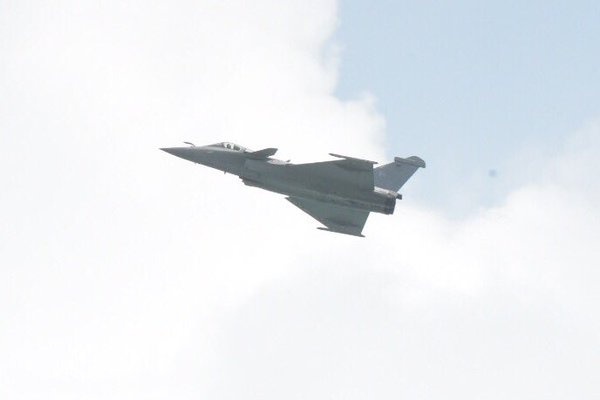 Rafale của Không quân Pháp phô diễn trên không. Nước láng giềng Malaysia cũng cử máy bay chiến đấu SU‑30MKM nổi tiếng với tải trọng vũ khí lên tới 8.000 kg và phạm vi chiến đấu gần 1.300 km. |