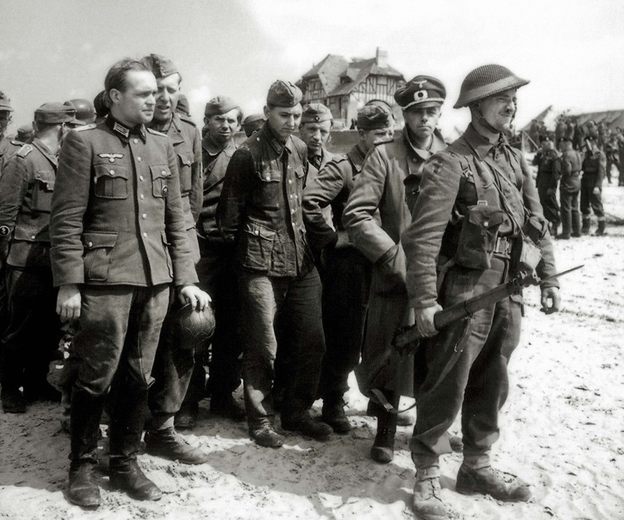 | Lính Anh canh giữ những binh sĩ Đức Quốc xã bị bắt làm tù binh trên bãi biển ở thị trấn Bernieres-sur-Mer. Theo Wikipedia, dân số ở thị trấn này chưa đến 1.000 người vào giai đoạn cuối của Thế chiến II. Đến năm 2008, khoảng 2.400 người đang sống tại đây. |