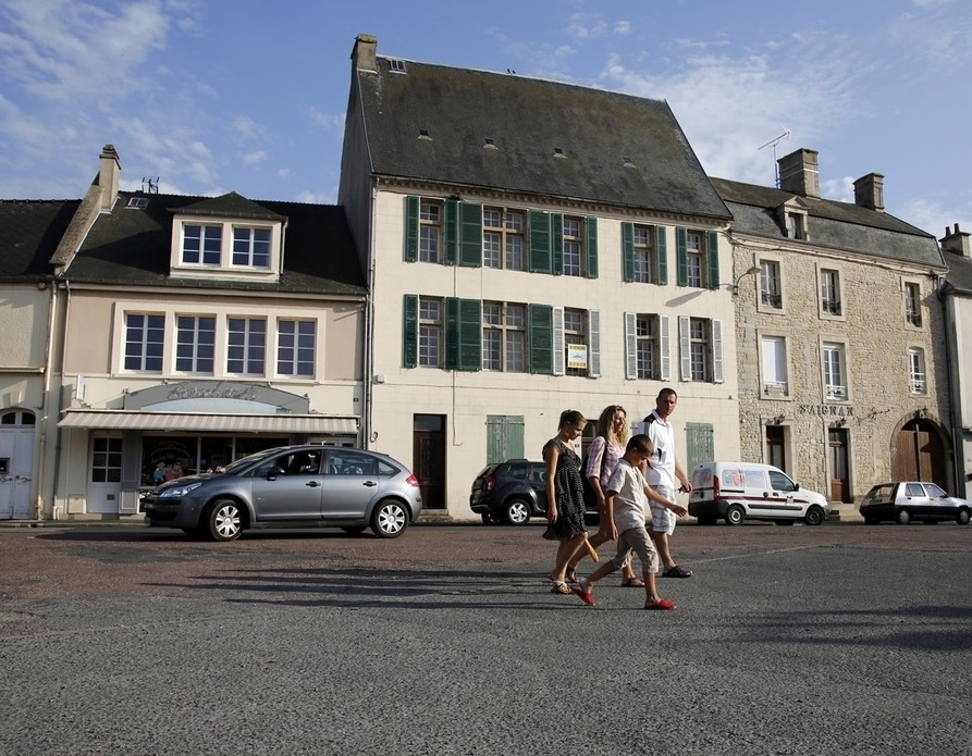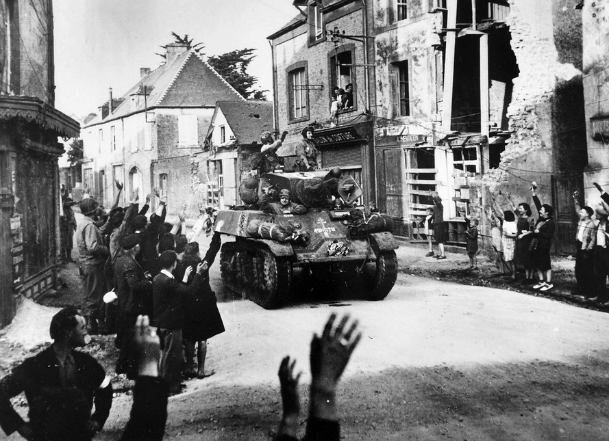 | Người dân thị trấn St Mere Eglise chào đón xe tăng của quân đội Pháp trong ngày đổ bộ. Hiện nay, thị trấn thu hút phần lớn những người quan tâm và tìm hiểu về lịch sử chiến dịch đổ bộ với nhiều bảo tàng, khu di tích. |