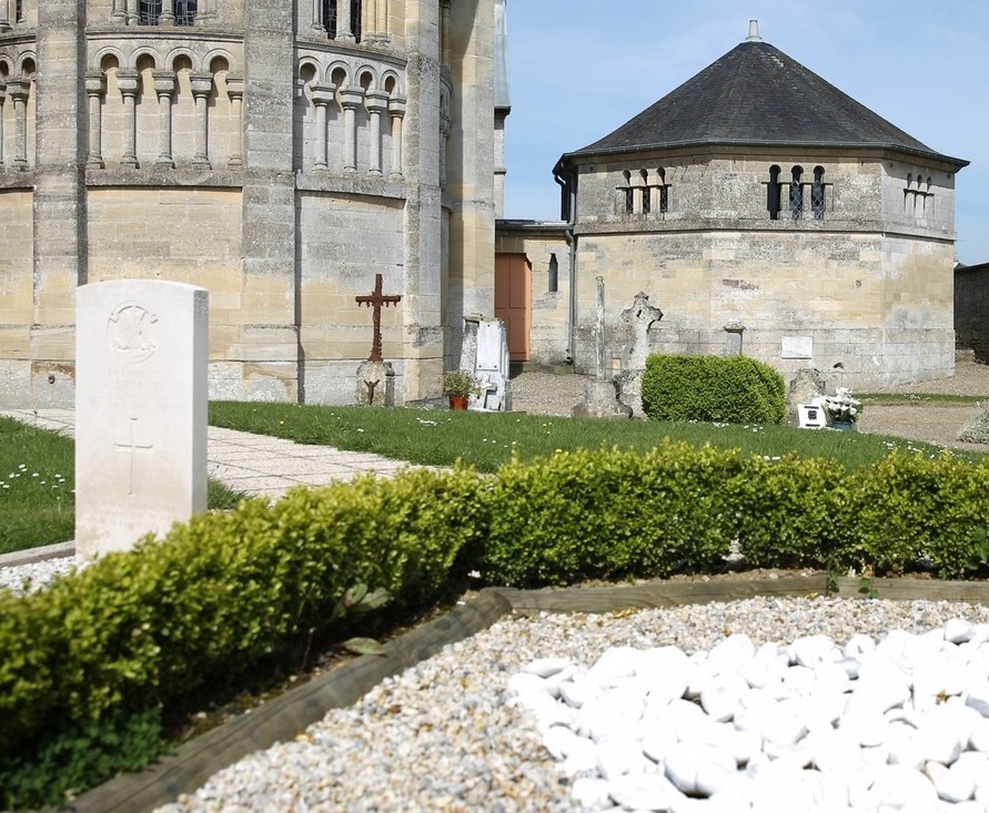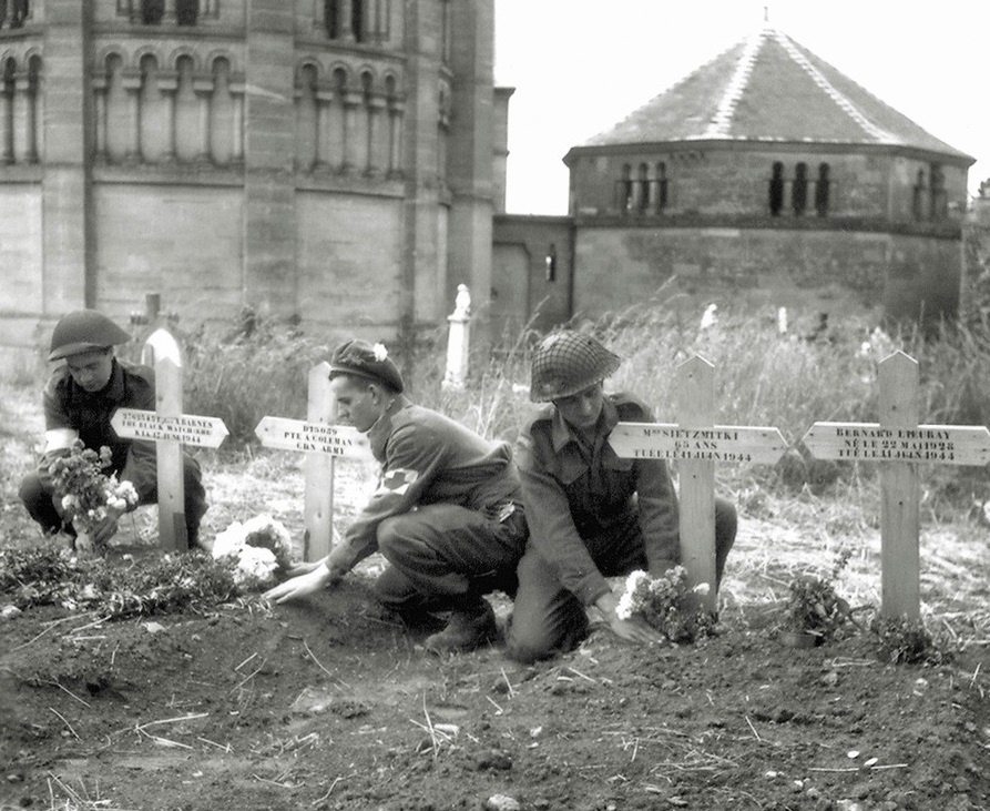 | Những người lính Canada đặt hoa lên mộ của những đồng đội hy sinh ở gần nhà thờ Saint Georges tại huyện Basly vào tháng 6/1944. Quân Đồng minh (gồm các nước Mỹ, Anh, Canada và Pháp) có khoảng 100.000 binh sĩ tử vong. Sau 70 năm, Basly vẫn là một địa phương nhỏ ở vùng Normandy, dân số chỉ khoảng 1.000 người vào năm 2008. |
