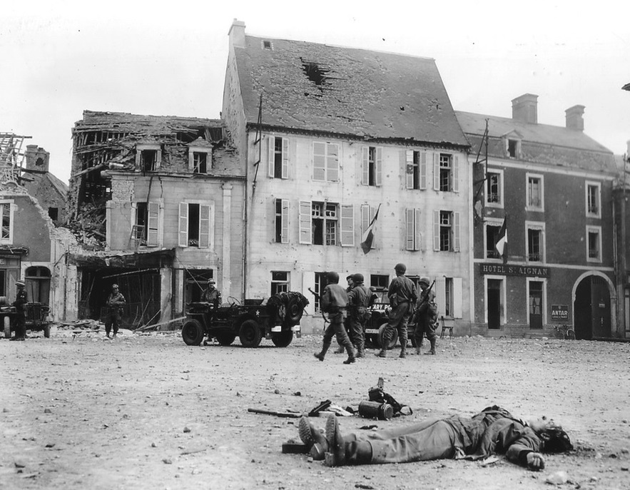 | Thi thể của một binh sĩ Đức tại quảng trường chính ở Place Du Marche ngày 15/6/1944. Đây là một trong những thị trấn đầu tiên mà binh sĩ Mỹ chiếm quyền kiểm soát. Sau chiến dịch đổ bộ của phe Đồng minh, Đức Quốc xã có hơn 23.000 lính tử trận, hơn 67.000 người bị thương và khoảng 20.000 người mất tích hay bị bắt. |