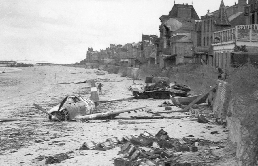| Máy bay chiến đấu Mỹ rơi tại vùng biển phía trước thành phố Saint-Aubin-sur-Mer ở Pháp vào tháng 6/1944. Ngày nay, đây là một trong những bãi biển thu hút đông khách du lịch. |