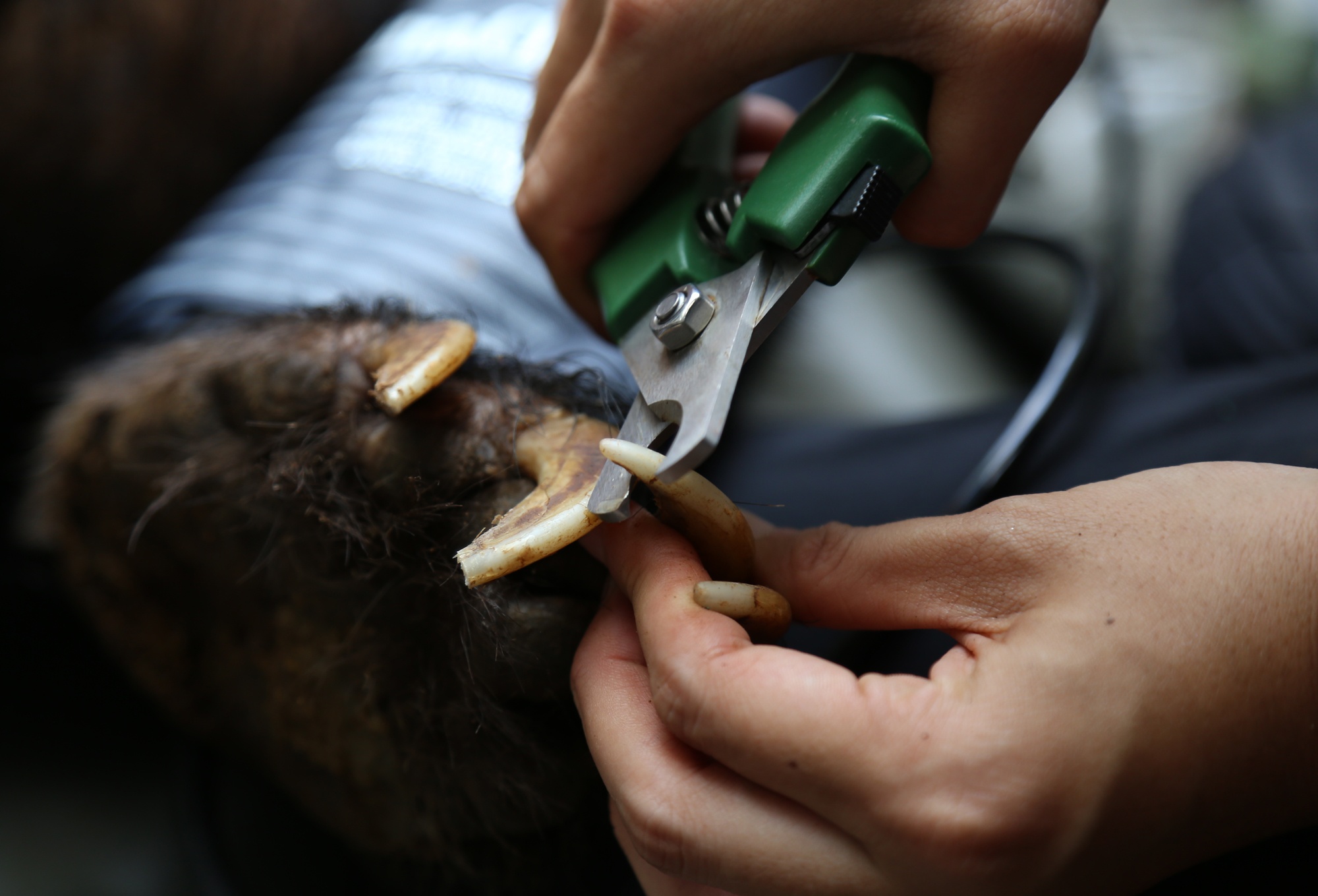 Móng chân gấu được cắt tỉa gọn gàng để không bị cắm vào thịt cũng như để tránh sát thương khi gấu được thả cùng chuồng, cùng khu với cá thể gấu khác.