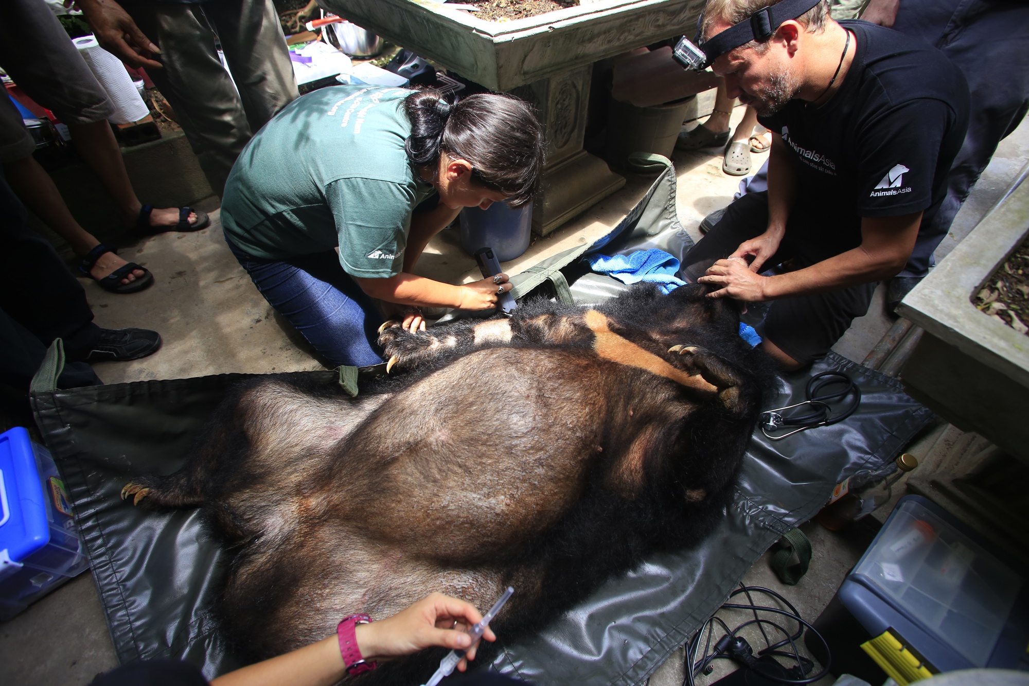Ngay sau khi đưa gấu ra khỏi chuồng, những cá thể bị gây mê này sẽ được các bác sĩ khám tổng thể gồm mắt, tai, răng sau đó lau tai, cắt móng cho chúng (để không đâm vào thịt gấu), kiểm tra ổ bụng, kiểm tra các khớp chân khớp tay, lấy mẫu máu, mẫu lông, mẫu phân và nước tiểu.