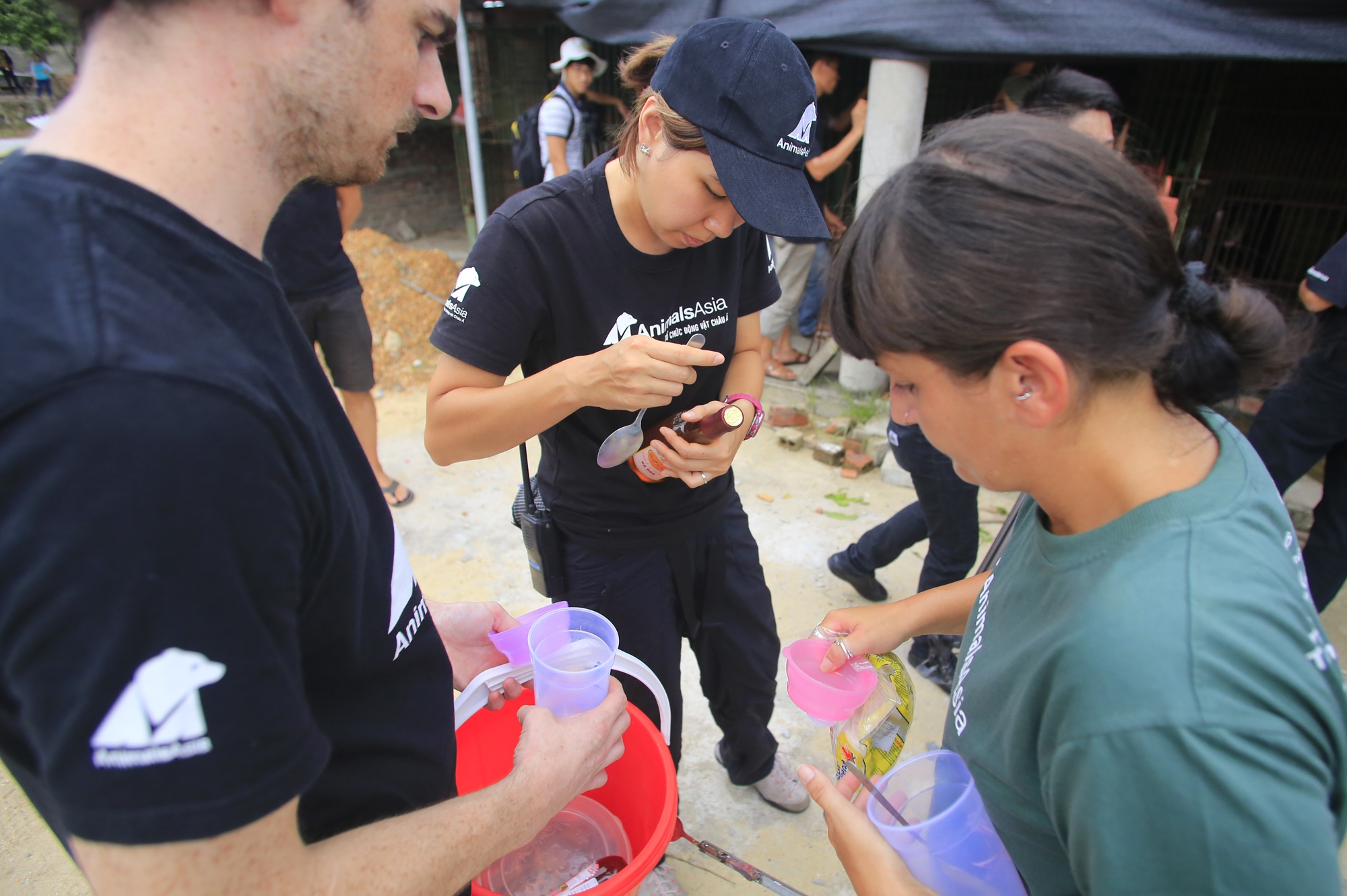 Hình ảnh tại trang trại của anh Nguyễn Thanh Nhượng (thị xã Quảng Yên) - một trong ba trại gấu mà Tổ chức Động vật châu Á đã tiến hành khám lâm sàng, phát hiện hơn 70% các cá thể gấu suy dinh dưỡng trầm trọng từ tháng 11/2014. Trong ảnh là vợ anh Nhượng, chị không cầm được nước mắt khi cho những cá thể gấu ăn lần cuối trước khi bàn giao.