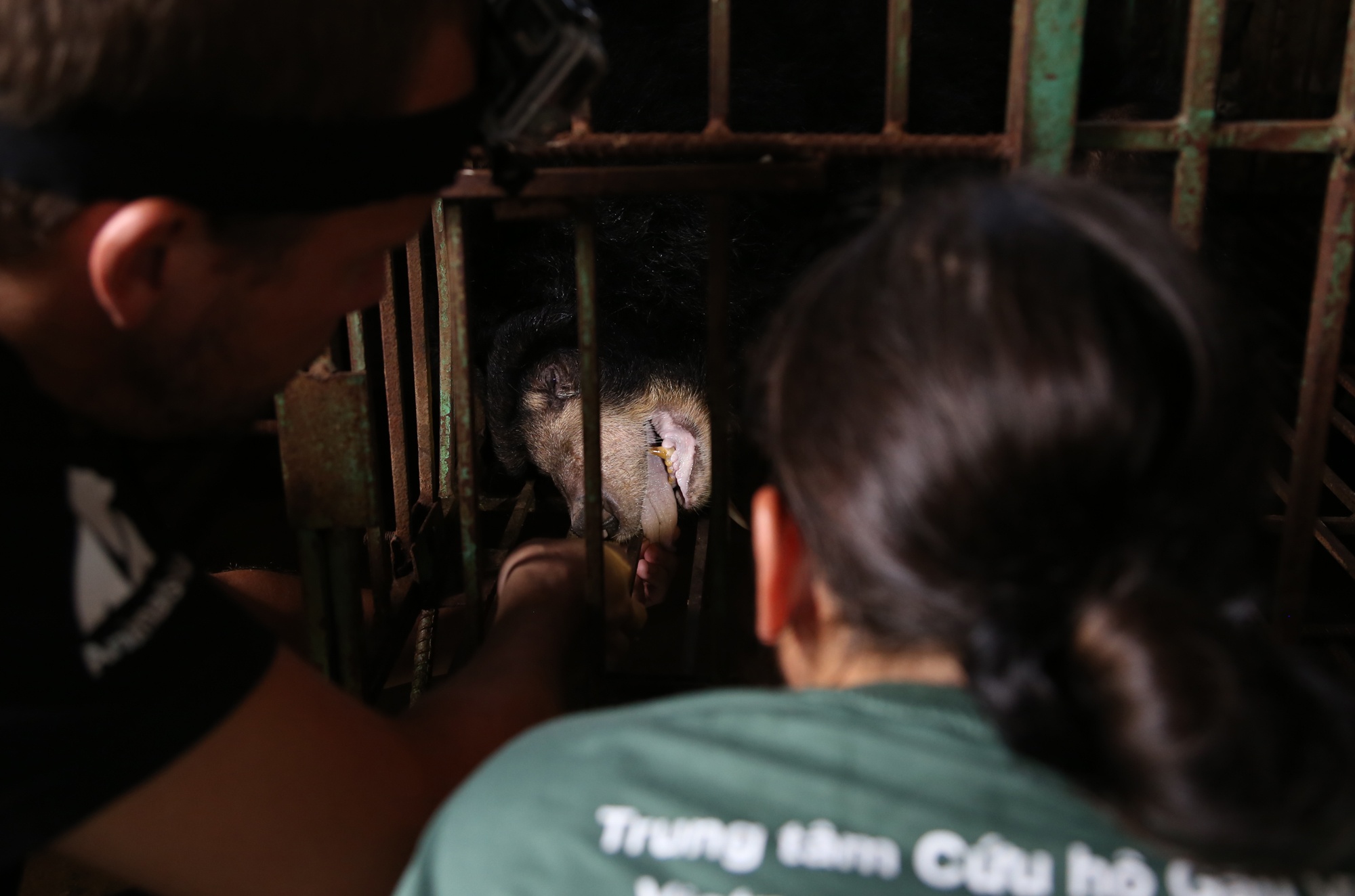 Cách thứ hai mất nhiều thời gian và công sức hơn là gây mê tại chỗ, áp dụng với những cá thể gấu hung dữ, gấu quá yếu, liệt chi, chuồng thiết kế phức tạp. Trong ảnh, hai bác sĩ thú y kiểm tra mắt, tai và lưỡi gấu sau 15 phút gây mê.
