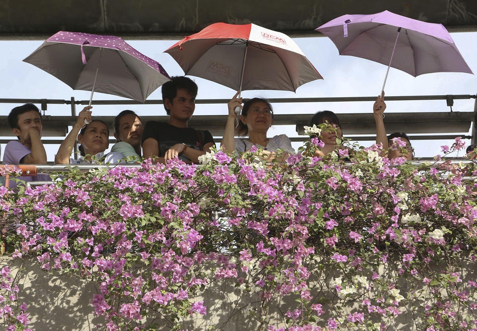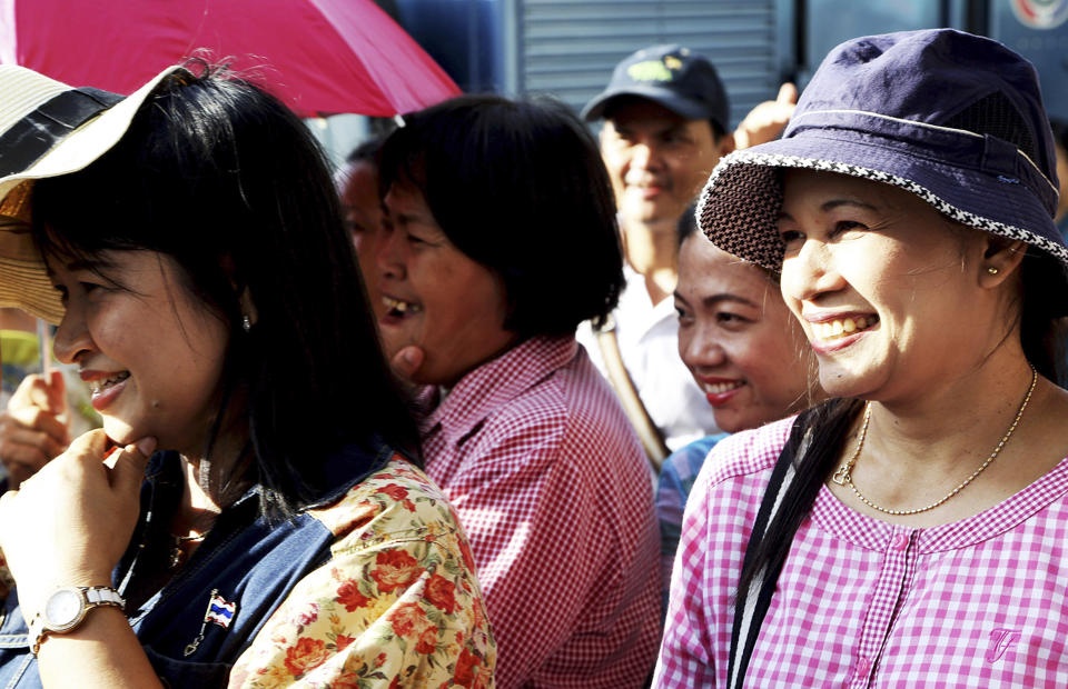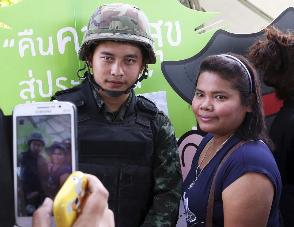 | Người dân cười khi xem một tiết mục ca hát do binh sĩ thực hiện ở Tượng đài Chiến thắng tại thành phố Bangkok. |
