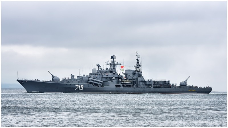 Tàu khu trục Bystry số hiệu 715 là chiến hạm thuộc lớp Sovremennyy. Các tàu lớp này chuyên trách chống hạm và phòng không. Tải trọng choán nước tối đa của các tàu lớp này lên tới 7.940 tấn. Bystry và các tàu cùng loại dài 156 m, rộng 17,3 m và di chuyển với vận tốc 32,7 hải lý, tương đương 62 km/h. Ảnh: RIA Novosti