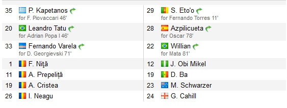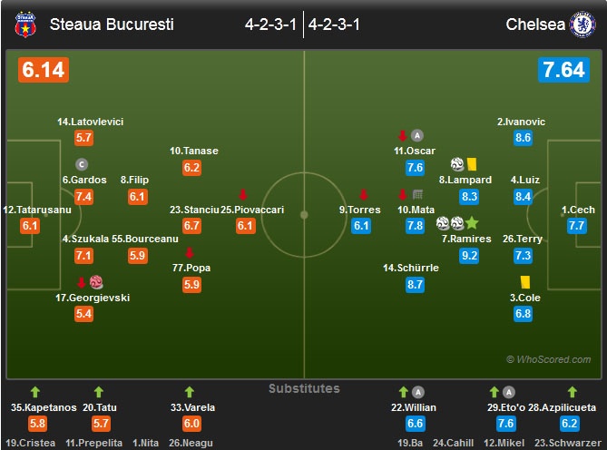 Ở trận đấu trên sân của Steaua Bucuresti, HLV Mourinho bố trí Oscar và Juan Mata trong đội hình xuất phát. Màn trình khá tốt thời gian gần đây giúp Mata được sử dụng thường xuyên hơn. Trên hàng công, Fernando Torres ra sân từ đầu. Tuy nhiên, tiền đạo người Tây Ban Nha đã phải nhường chỗ cho Samuel Eto’o chỉ sau 8 phút thi đấu do dính chấn thương.