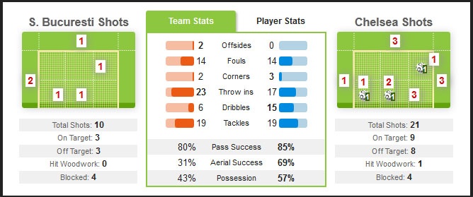 Khoảng thời gian cuối hiệp 1, Steaua Bucuresti có những tình huống tấn công khá nguy hiểm. Phút 40, thủ môn Petr Cech phải băng ra khỏi vòng 16m50 phá bóng giải nguy cho khung thành Chelsea. Tuy nhiên, đội chủ nhà bất ngờ nhận thêm một bàn thua ở phút 44. Từ tình huống lên bóng tốc độ bên cánh trái, Samuel Eto’o tung cú sút buộc thủ môn Tatarusanu đẩy bóng ra, nhưng đáng tiếc cho Steaua khi cầu thủ lao về hỗ trợ phòng ngự Danijel Georgi lại luống cuống đá phản lưới nhà.