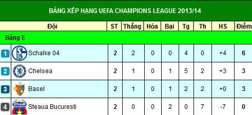 Ở trận đấu còn lại thuộc bảng E giữa Basel và Schalke diễn ra cùng giờ, đội bóng Đức đánh bại đối thủ với tỷ số cách biệt tối thiểu 1-0. Sau hai lượt trận vòng bảng E, Schalke dẫn đầu khi có 6 điểm. Còn với Chelsea, đội bóng của Anh đã leo lên vị trí thứ hai, cùng được 3 điểm với FC Basel nhưng có hiệu số bàn thắng bại tốt hơn.
