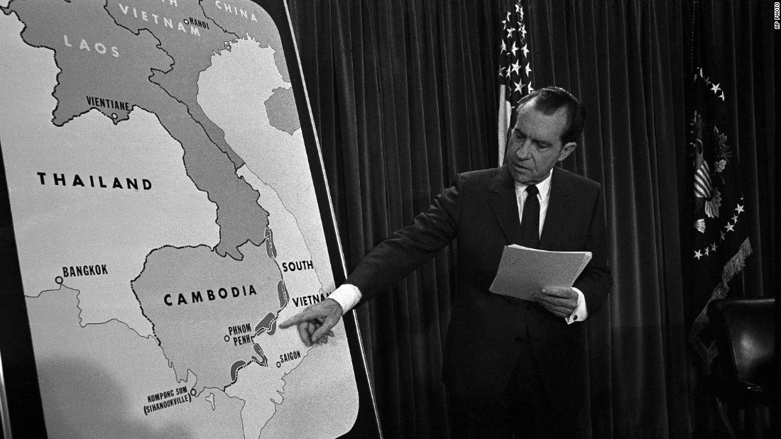 Tổng thống Mỹ Richard Nixon chỉ vào tấm bản đồ Đông Dương tại Nhà Trắng và yêu cầu quân đội Mỹ tấn công căn cứ ở Campuchia tháng 4/1970. Mục tiêu của Nixon là xóa sổ các trạm tiếp tế của bộ đội Việt Nam. Ảnh: AFP |