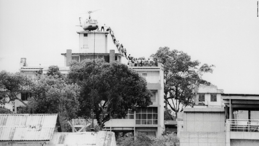 Thiếu sự hỗ trợ của Mỹ, quân đội Việt Nam Cộng hòa nhanh chóng bị quân Giải phóng đánh bại trên các mặt trận. Ngày 29/4/1975, nhân viên CIA hỗ trợ sơ tán trên nóc tòa nhà gần đại sứ quán Mỹ ở Sài Gòn. Ảnh: CORBIS |