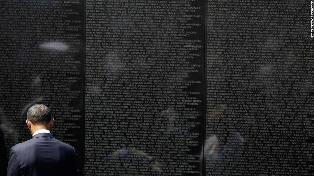 Tổng thống Barack Obama đứng trước Khu tưởng niệm Chiến tranh Việt Nam ở thủ đô Washington, Mỹ, tháng 5/2002. Những tấm bia khắc tên 58.000 người Mỹ thiệt mạng trên chiến trường Việt Nam. Ảnh: Getty |