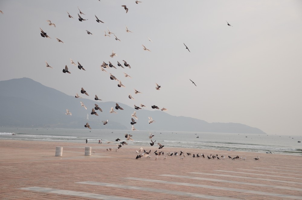 | Thời gian gần đây, trên bãi biển Phạm Văn Đồng (Đà Nẵng) xuất hiện rất nhiều chim bồ câu. |