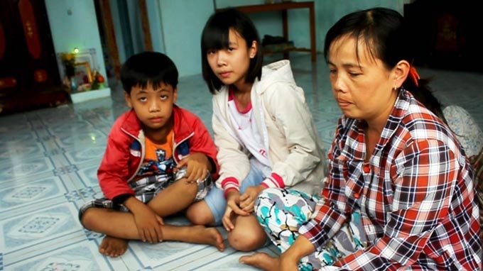 | Vợ và hai con nhỏ của thuyền trưởng Nguyễn Văn Sơn mong ngóng tin tức của chồng, cha. |