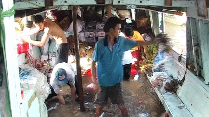 | Theo lời chủ tàu, lượng hàng hóa hư hại không dưới 3 tỷ đồng, chủ yếu là thức ăn tôm công nghiệp, bia, bánh mứt… |